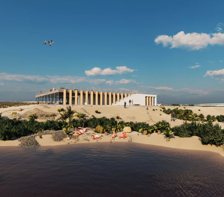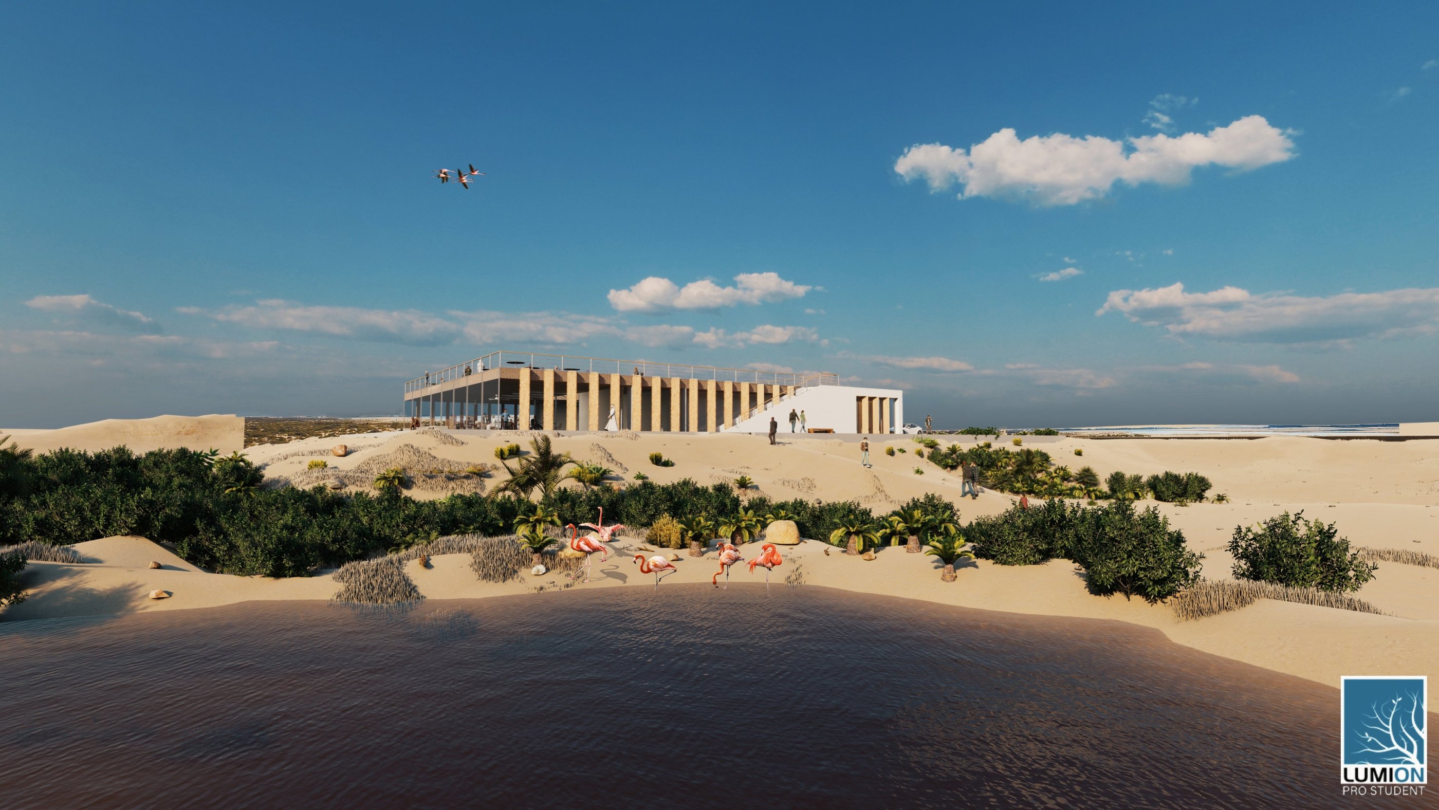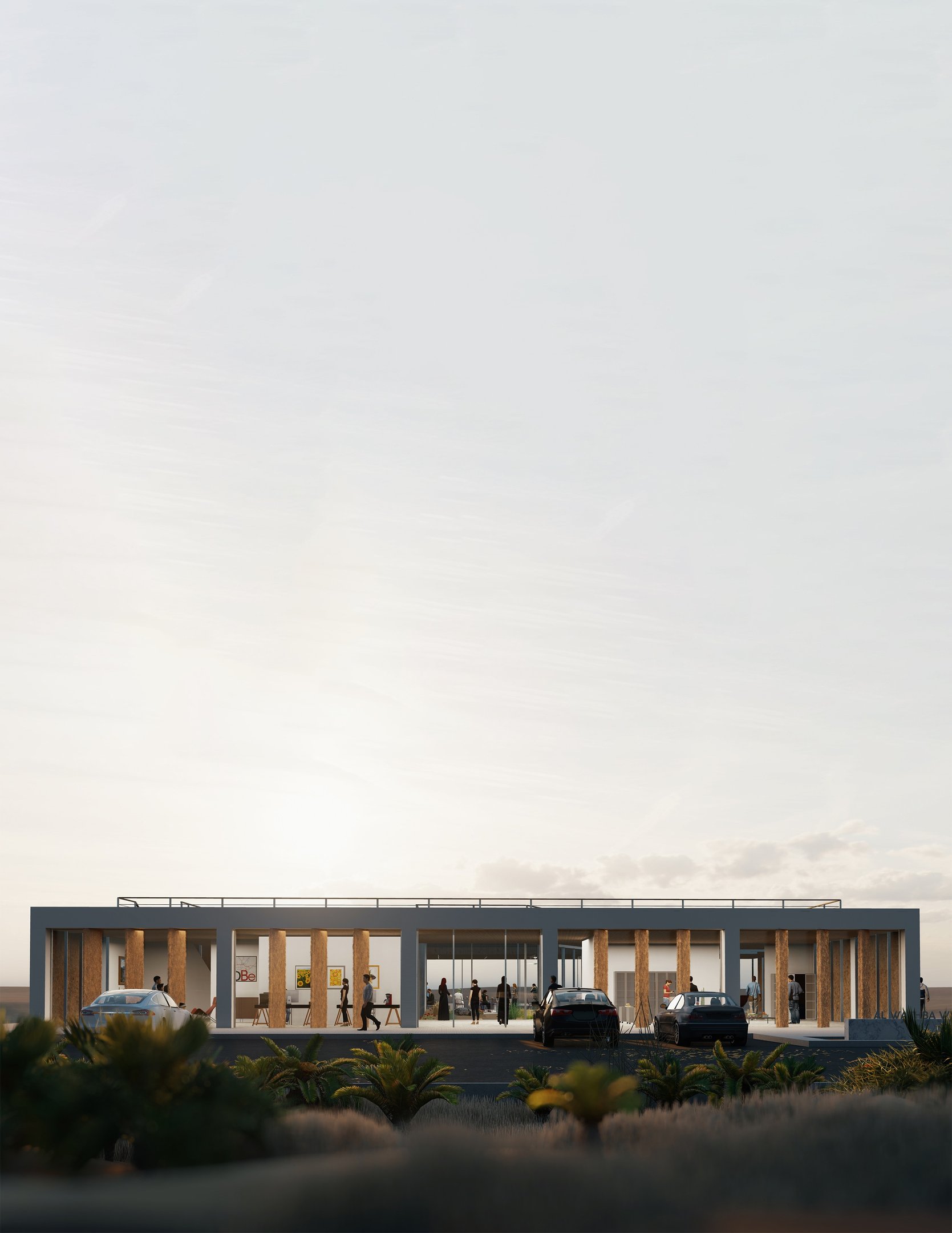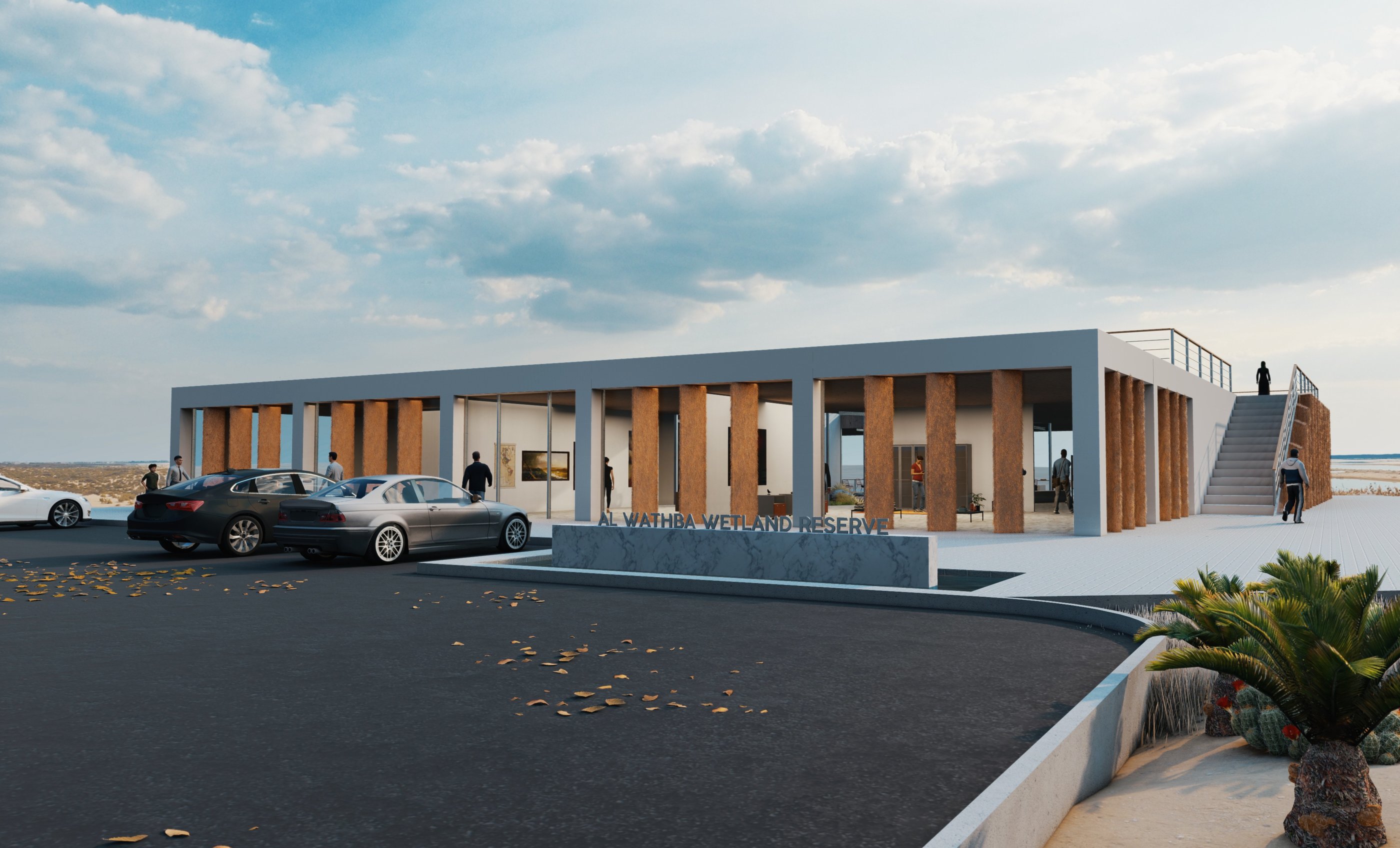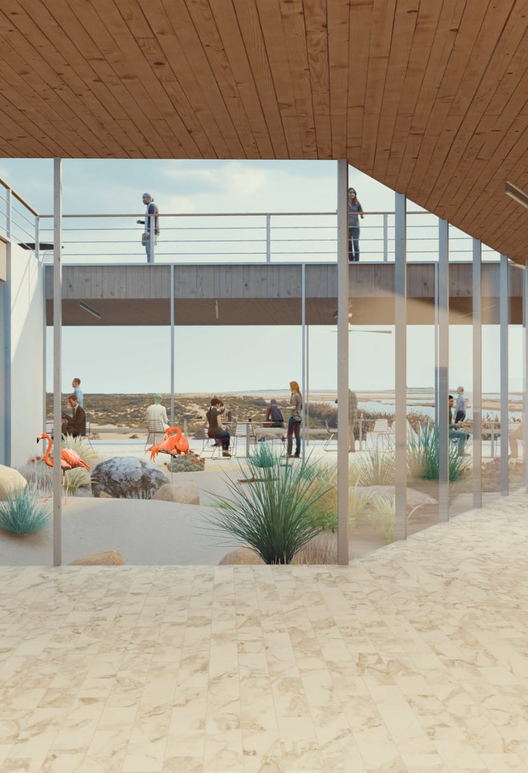 The Flamingo Visitor Center in the Al Wathba Wetland Reserve aims to offer visitors an up-close experience of the wildlife, while providing panoramic views of the natural landscape. Visitors can choose their prefered way to experience the reserve, whether it be from the rooftop observation deck, or peering through the windows at the surrounding vista. This proposal aims to integrate the wildlife found on the reserve with the visitor center. This is achieved through an animal rehabilitation initiative within the center. Visitors can view the animals inside the large courtyard located in the middle of the building.The building materials have been selected to ensure that the construction process is both affordable and sustainable, while integrating locally sourced components. Palm leaves are woven together to create the sun shading louvers, while bird-friendly glass ensures the safety of the variety of bird species found on the reserve. Minimal excavation is needed for the concrete slab foundation, keeping the landscape as undisturbed as possible.