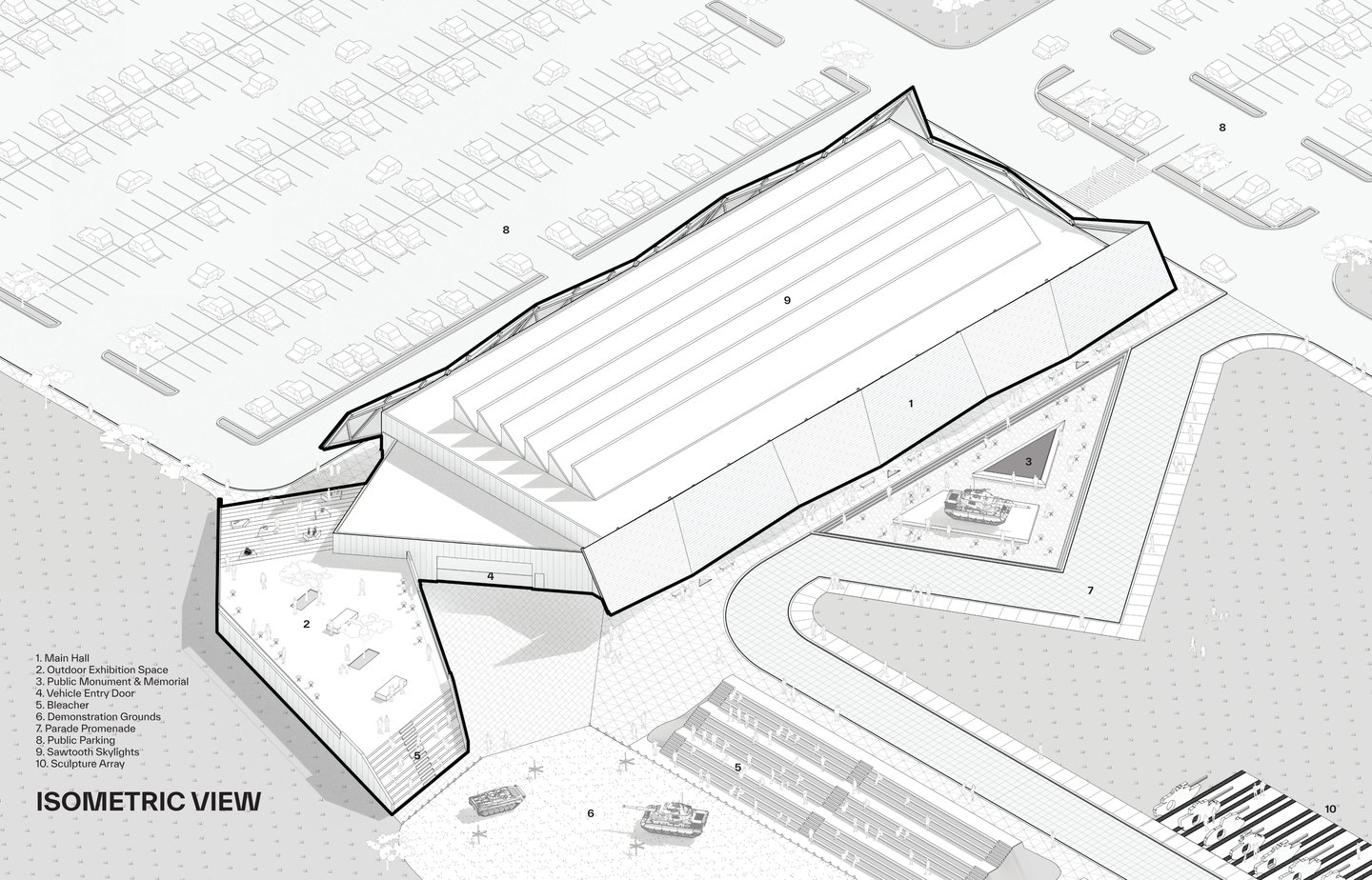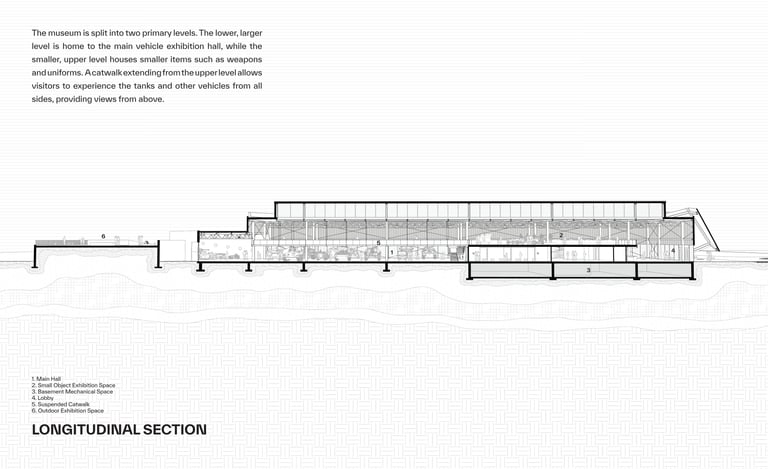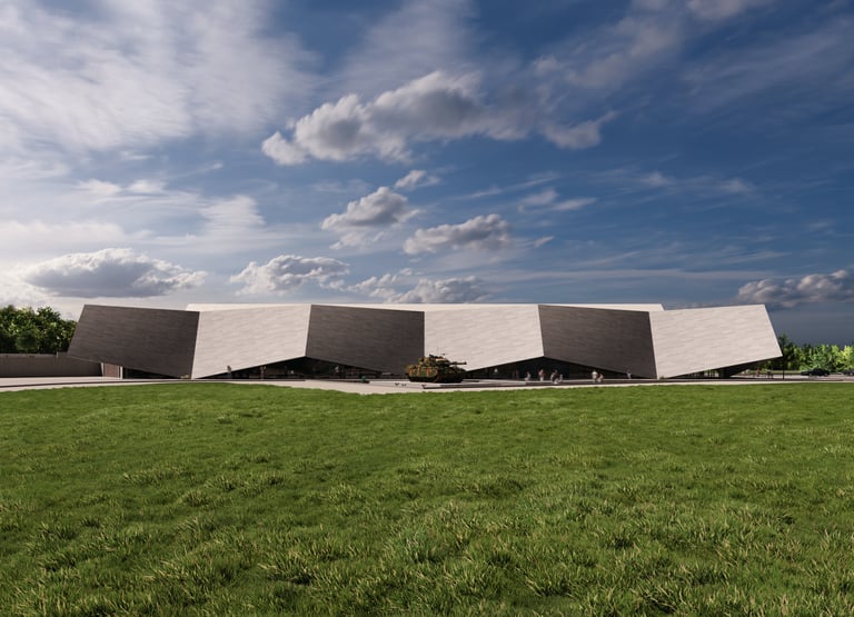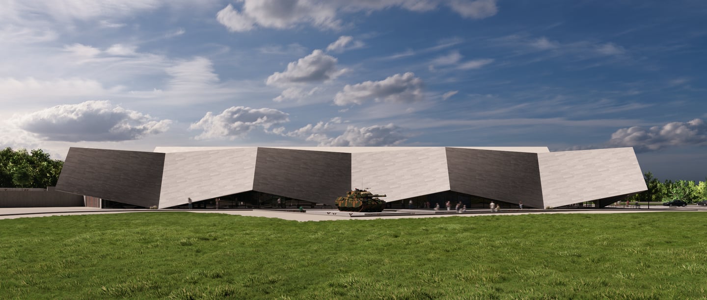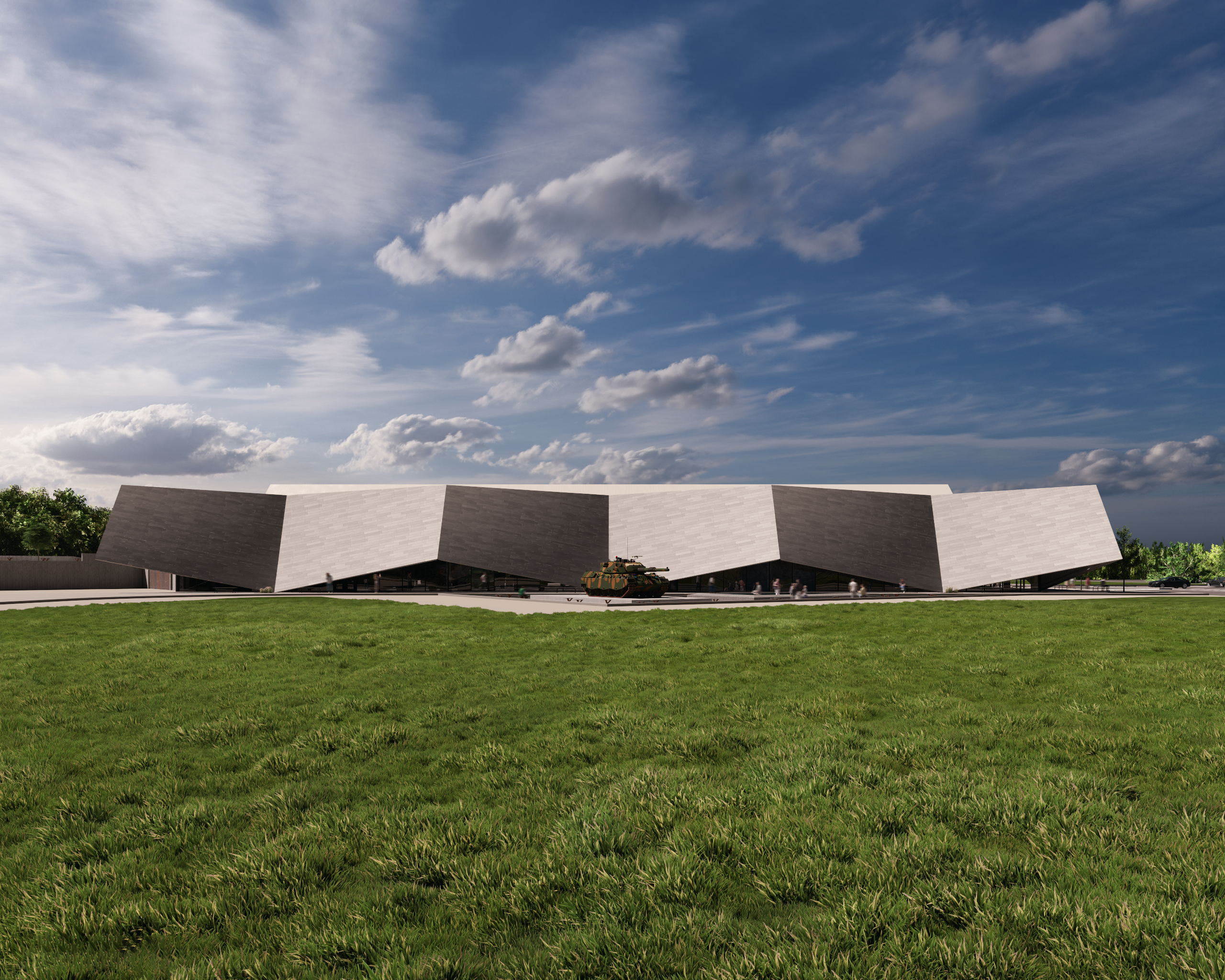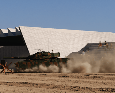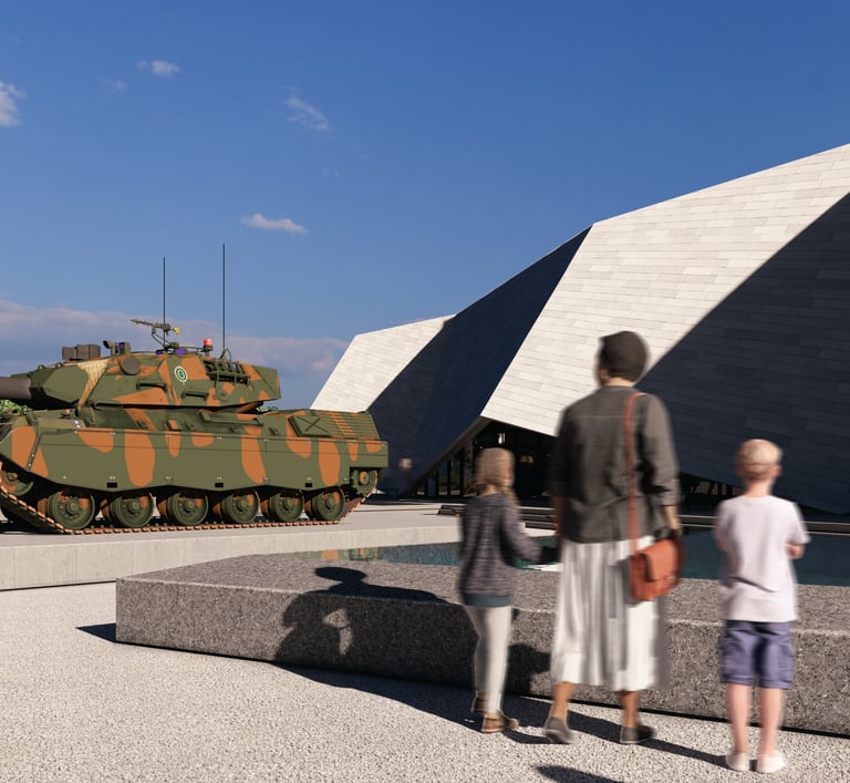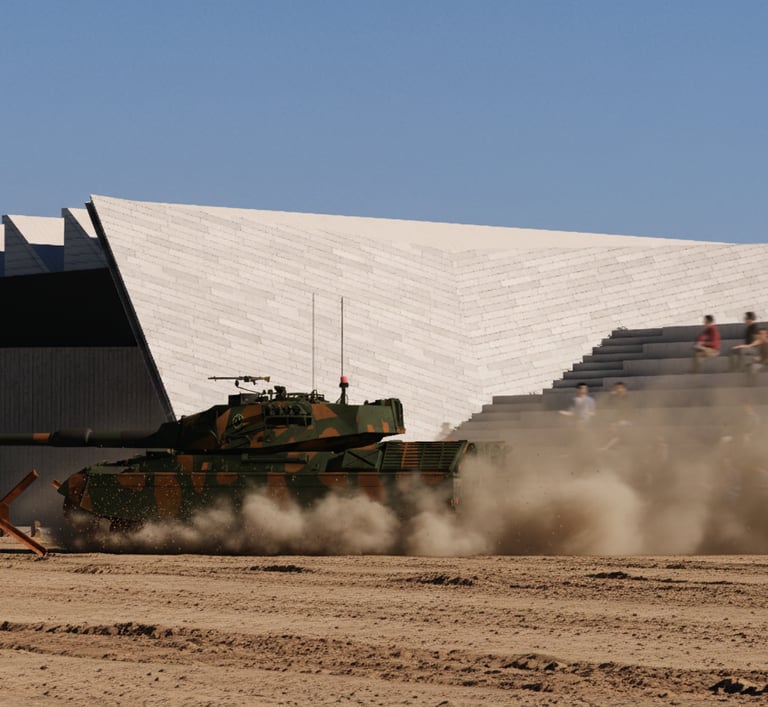 An angular facade references the Leopard 1 ‘s design, and presents itself as a physical fortification of armour that establishes a link to the materiality, purpose, shape, and form of tanks.
