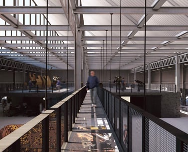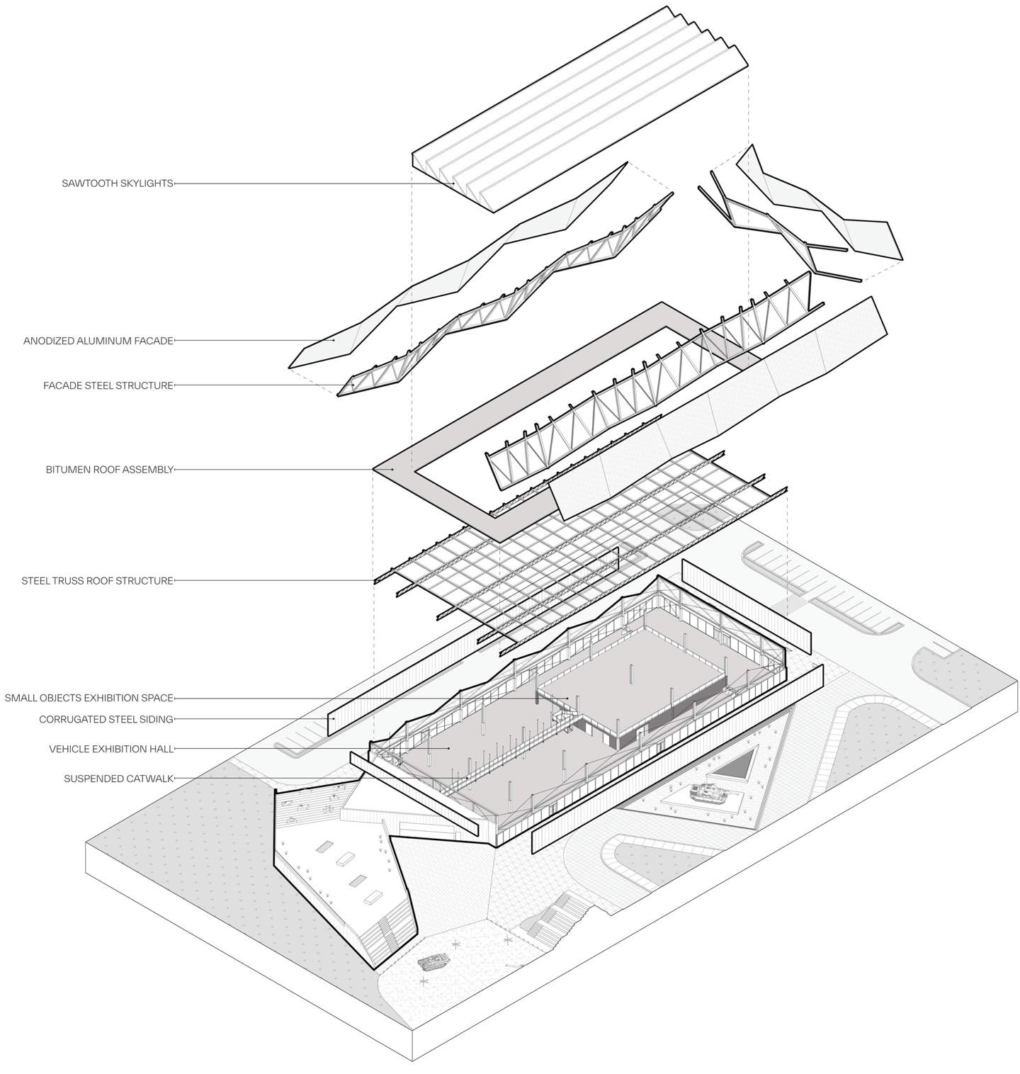 Establish a physical connection to key circulation paths through a multipurpose space that includes exhibition displays, outdoor arena seating, and an observation platform.