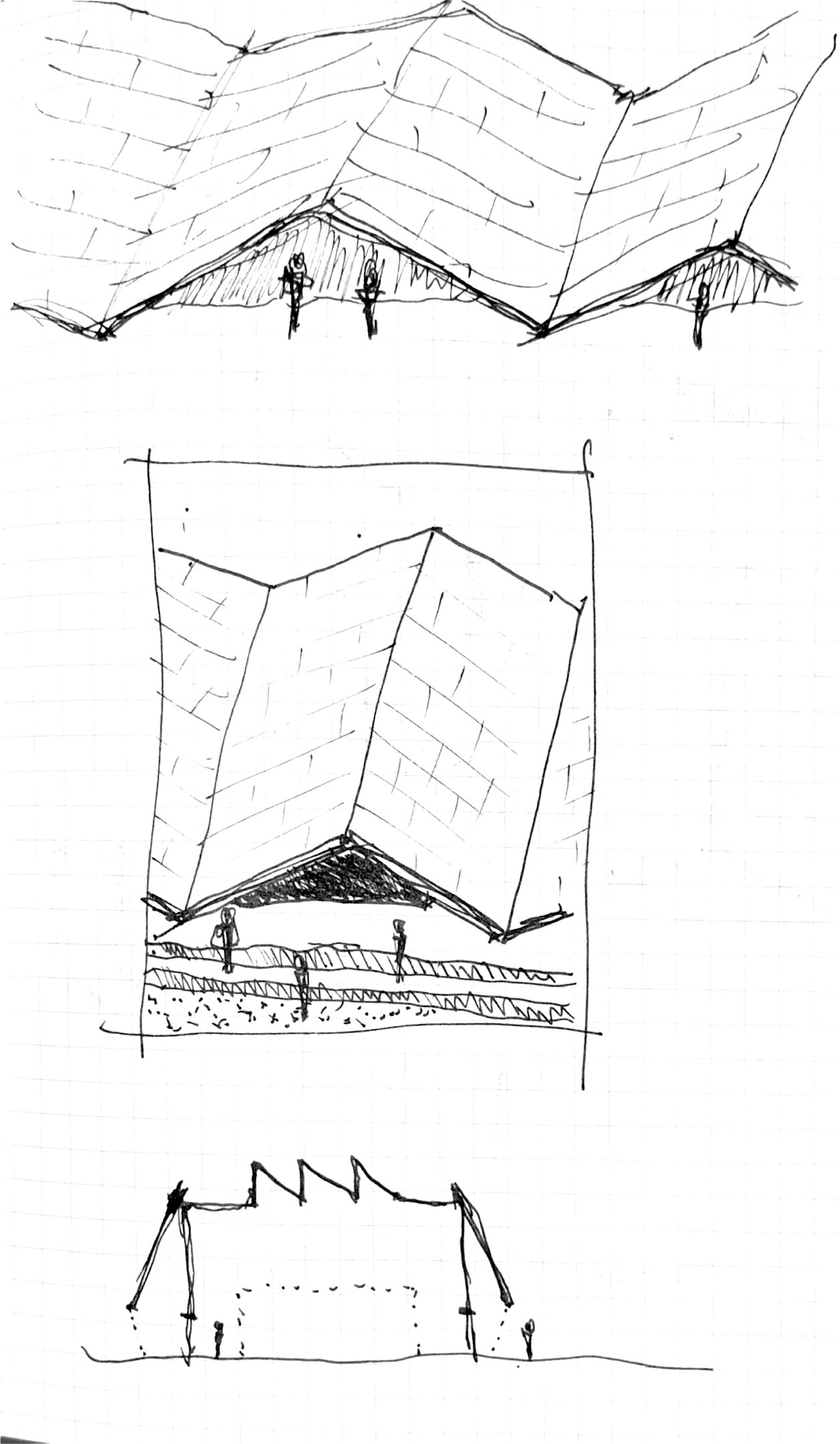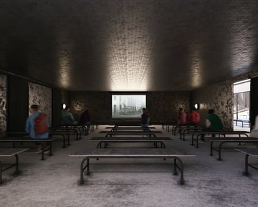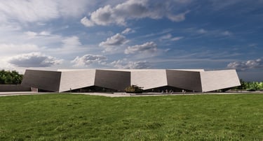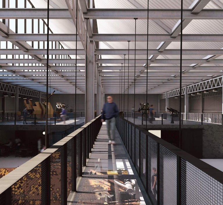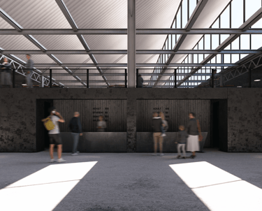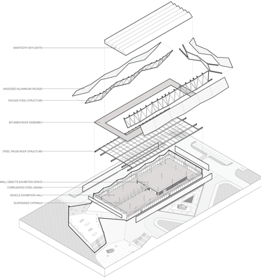 Construct a simple building utilizing utilitarian construction techniques that reference 20th century wartime production facilities. This creates a vast space in an economically conscious manner.