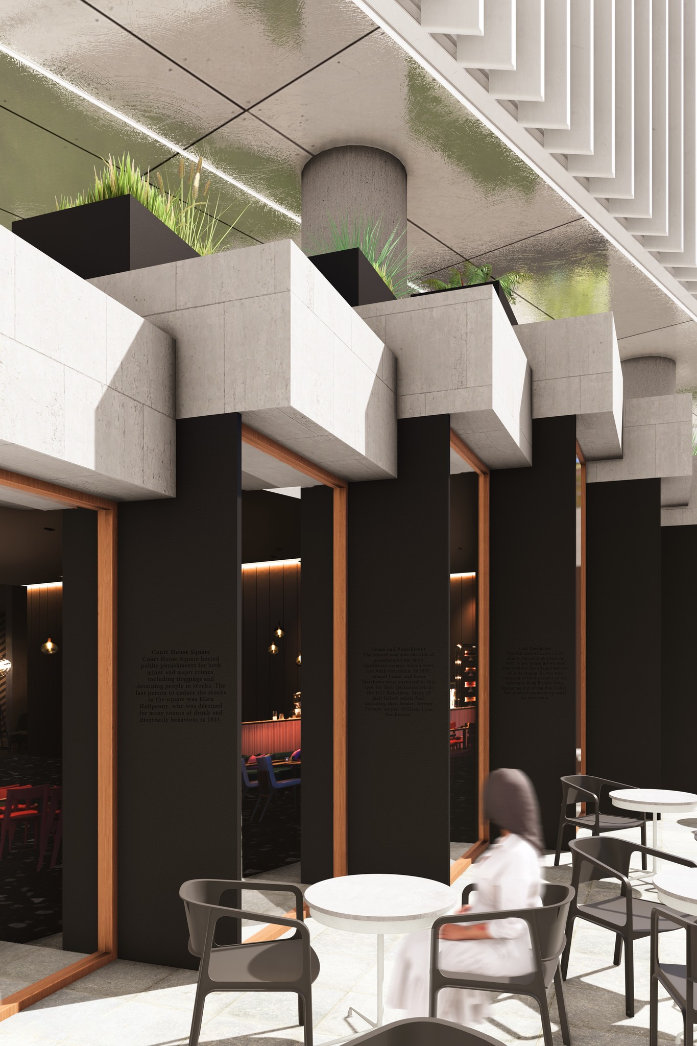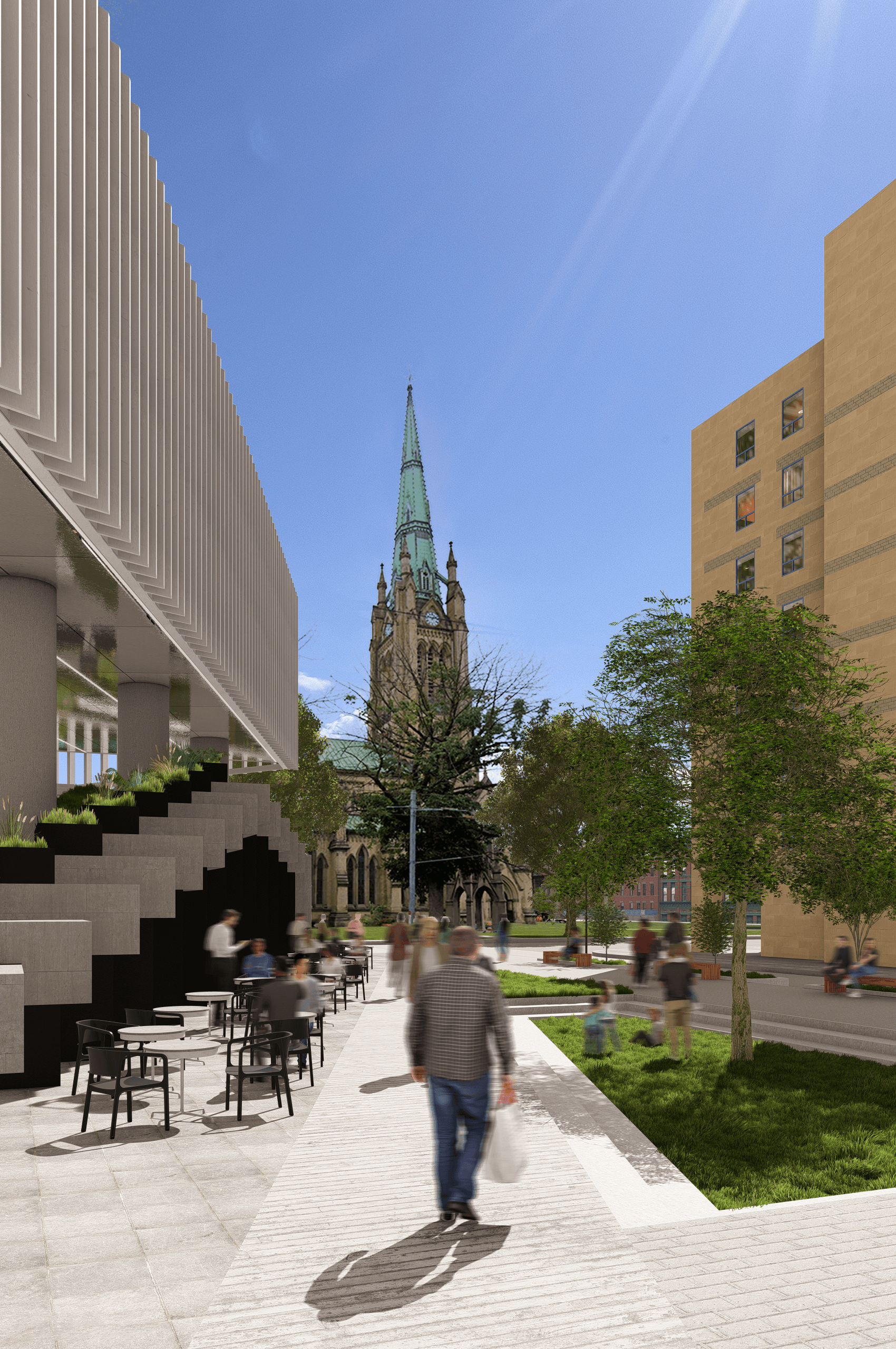 The viewing terrace is oriented to provide direct views between St. James Church and the historic Courthouse. Experiencing both of these buildings in a single space helps reinforce the narrative of old Toronto, and remind pedestrians of the history of the neighbourhood.
