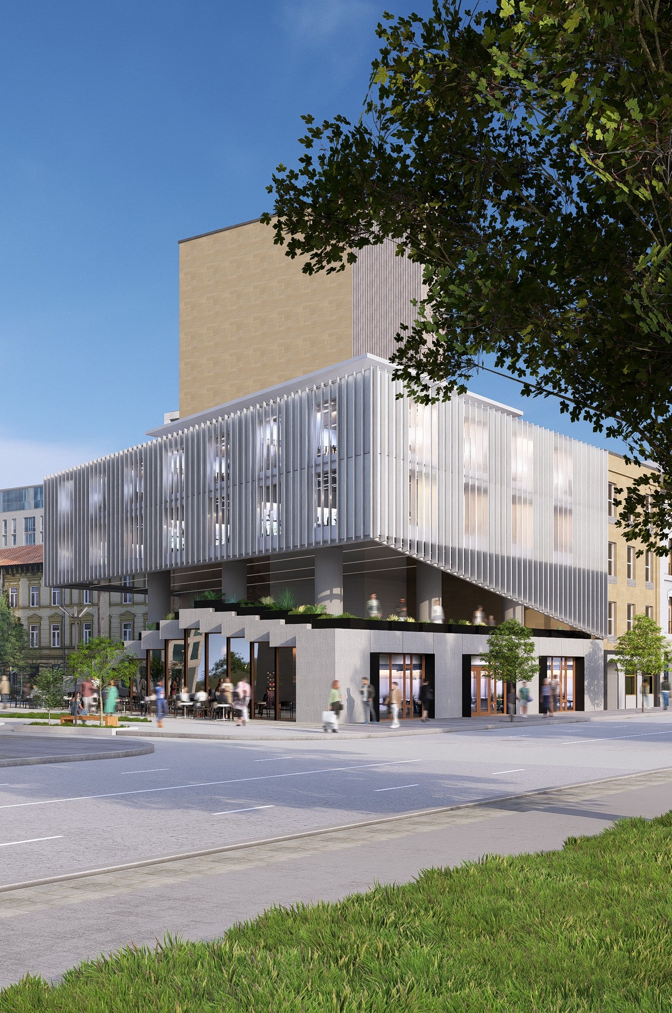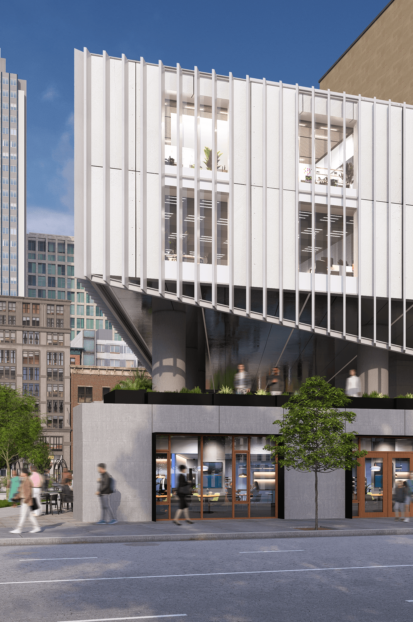 The south facade consists of a geometric, sculptural organization of forms that encourage interaction and visual interest among passerbys. This stepping form visually reflects the circulation path from the park, as pedestrians can 'step' up the new building to the elevated viewing terrace.
