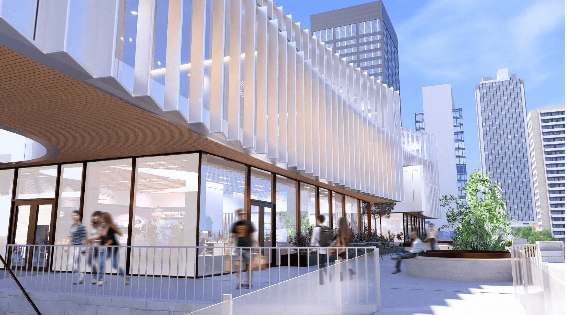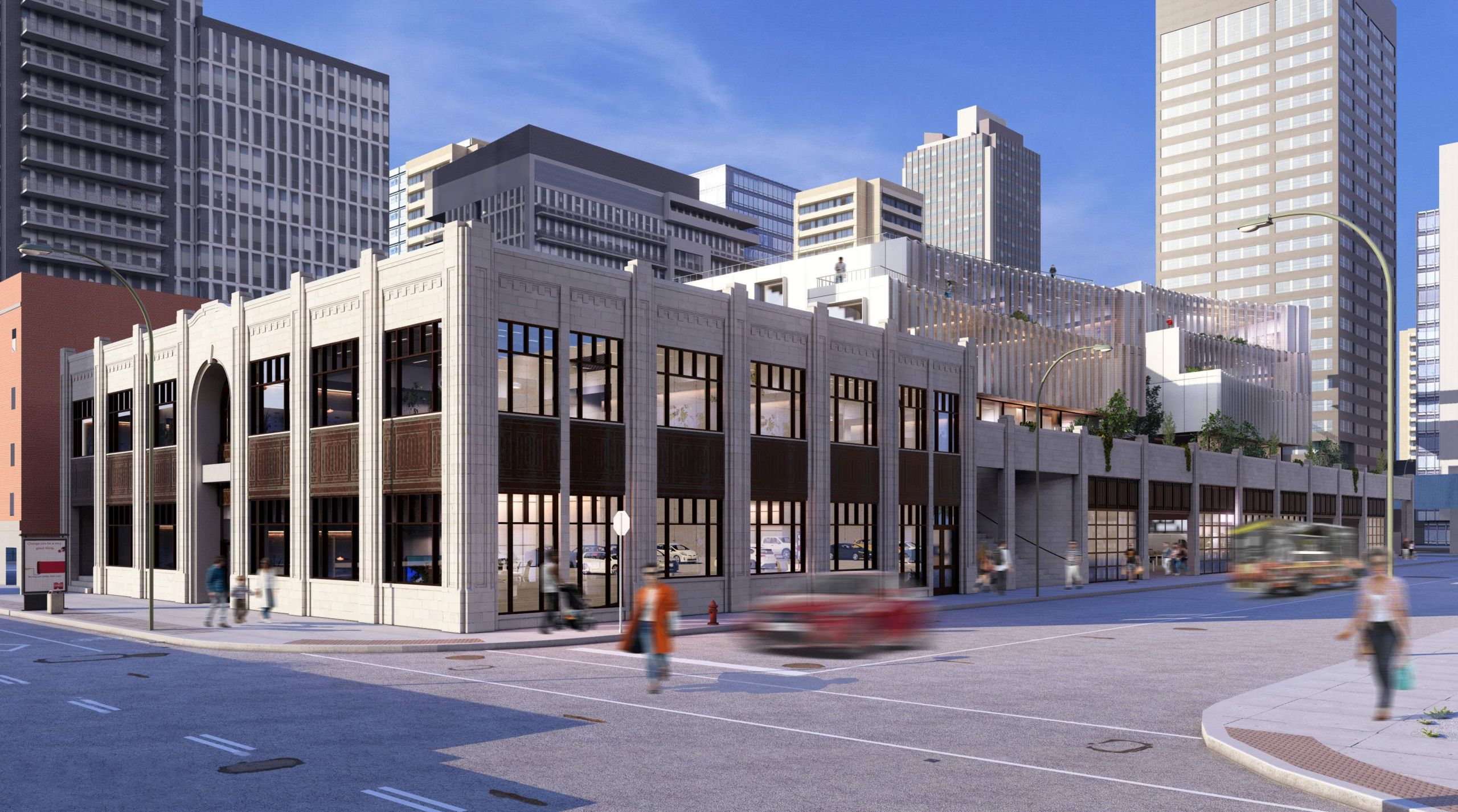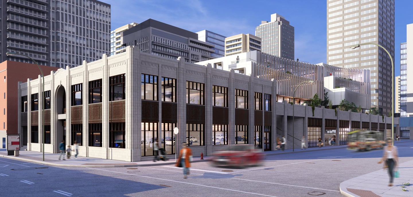 Densify the site in response to city guidelines and the surrounding context, while maintaining emphasis on the historic art-deco lobby building.