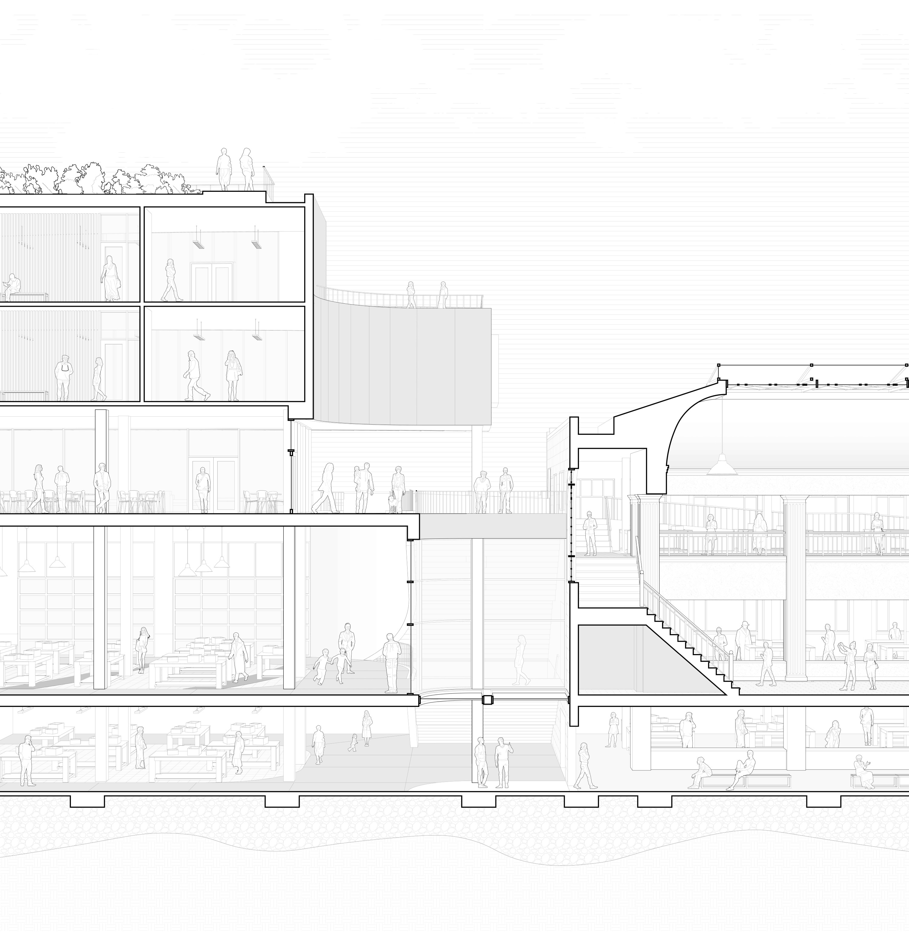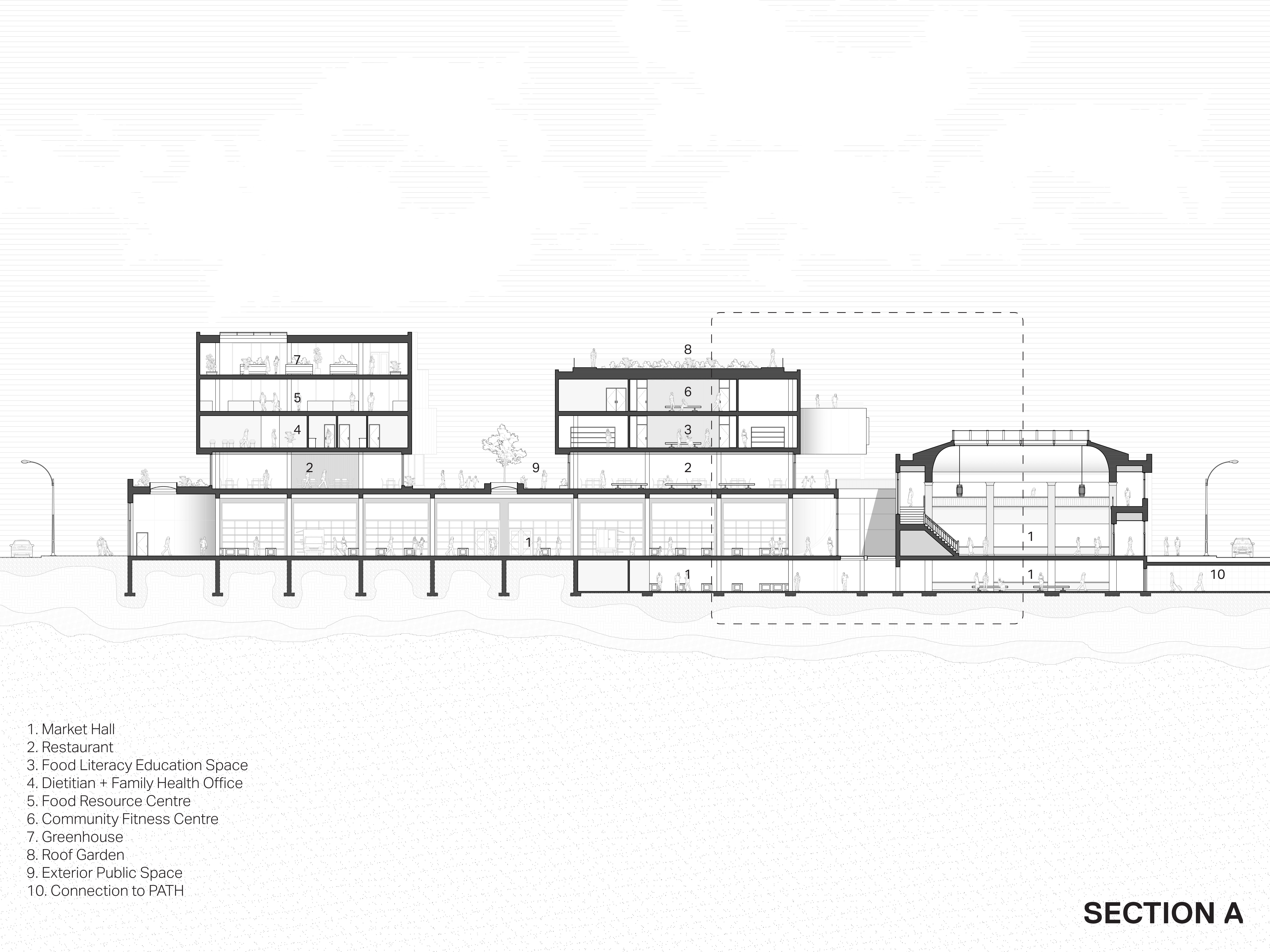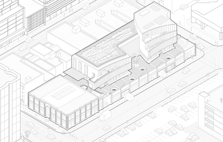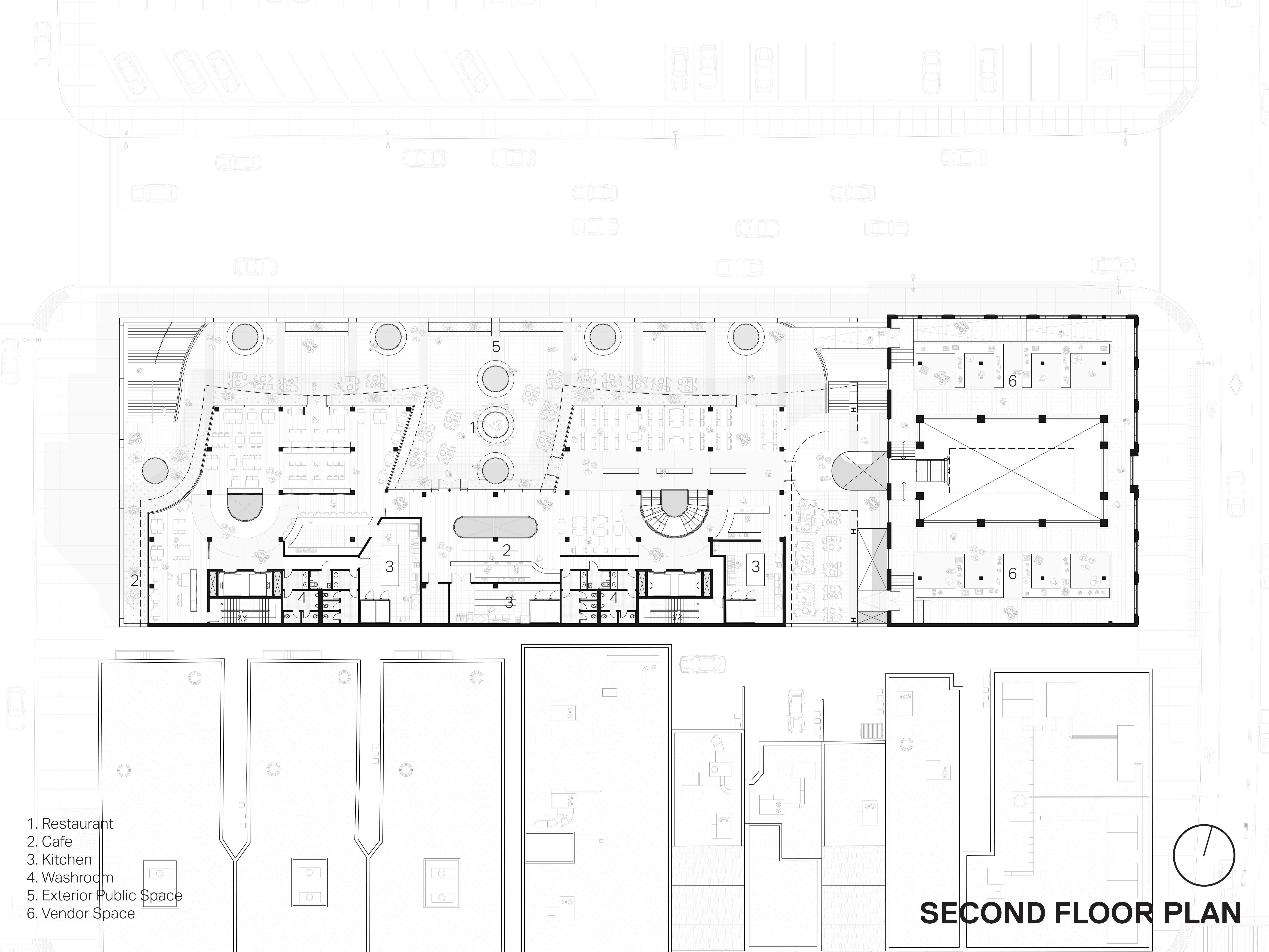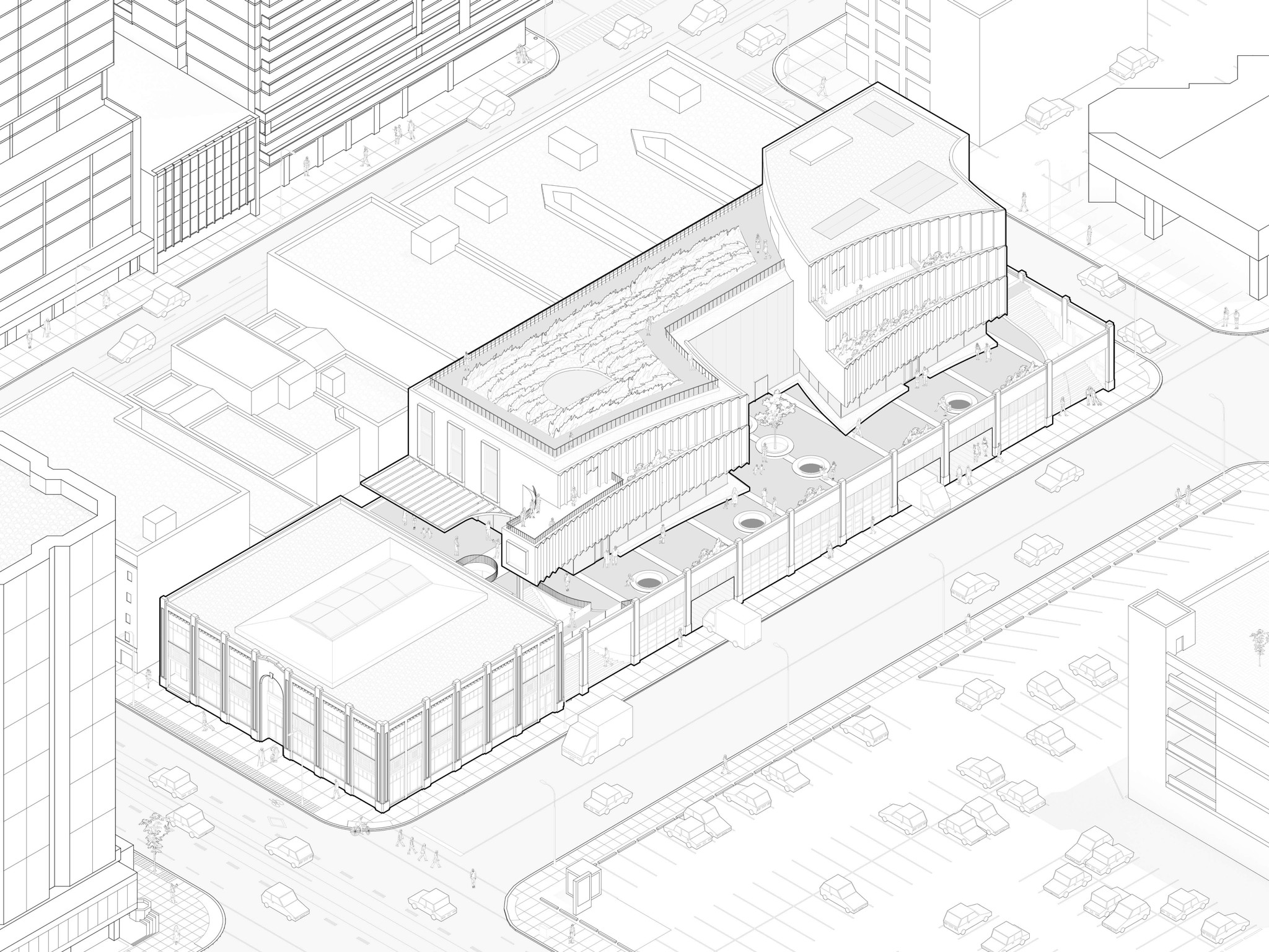 The Gray Coach Terminal conceptualizes a new life for a disused bus station in downtown Toronto. It envisions a lively market place that embraces the original art deco building and bus bays, converting it into an open air, all-season hub of activity. The original circulation paths of buses through the terminal are reflected in the new forms above which house community programming and retail areas, creating a palimpsest of the building's past. The material palette of the addition responds to the site's automotive history and expresses raw aluminum and metal formed into forms which borrow from classic bus designs. The terracing of the rooftop community spaces gently gestures towards the original art-deco terminal building, emphasizing its importance and respecting its conservative scale. The new marketplace utilizes the original bus entries for vendors to unload, and the garage-style doors allow for the market to spill onto the sidewalk in warmer weather. The original stained glass window with ‘Gray Coach’ branding becomes a centerpiece between the old and the new, residing in a lightwell which gives it visibility from the basement up to the roof terrace and spotlights the historical character of the building.