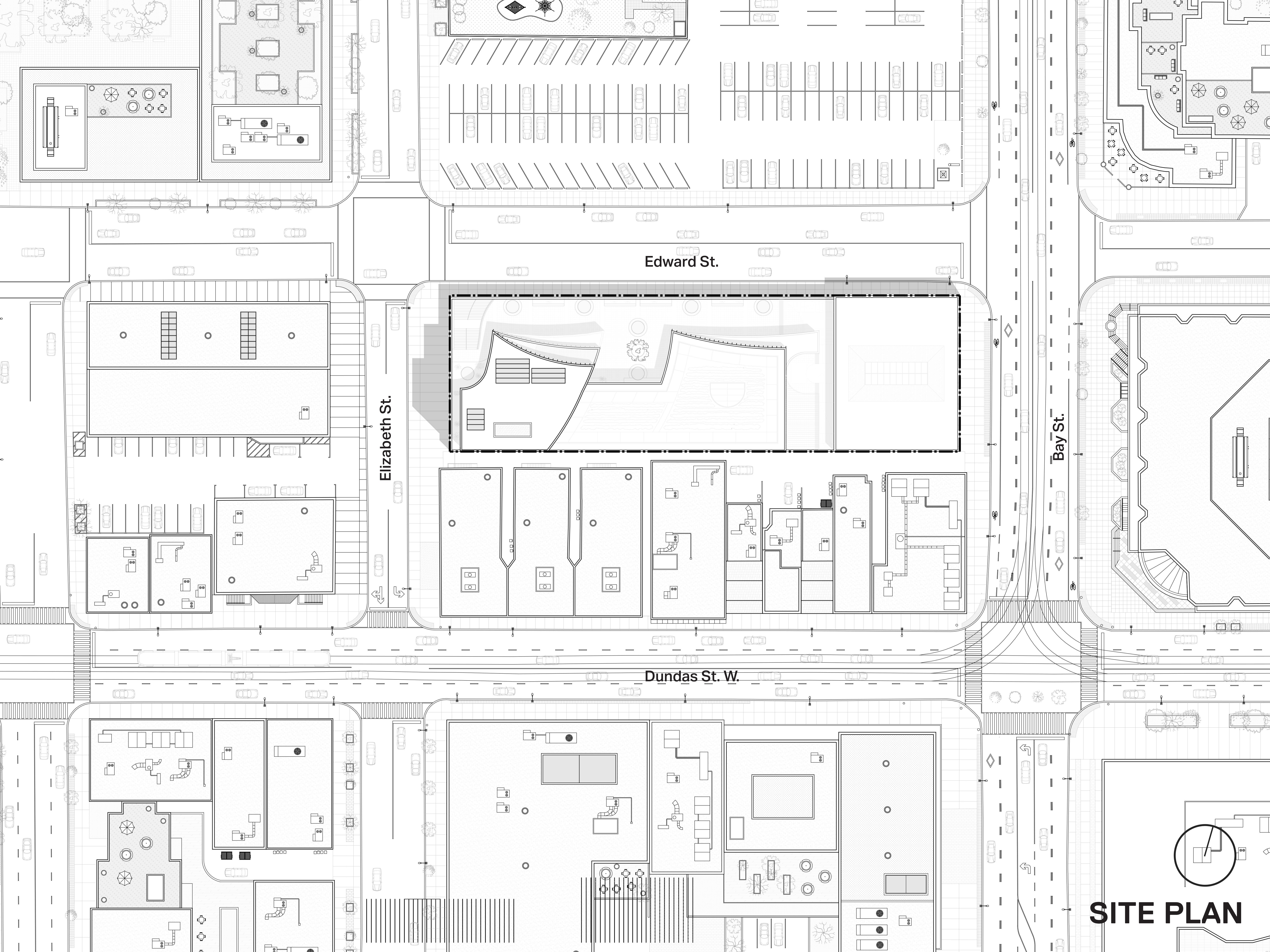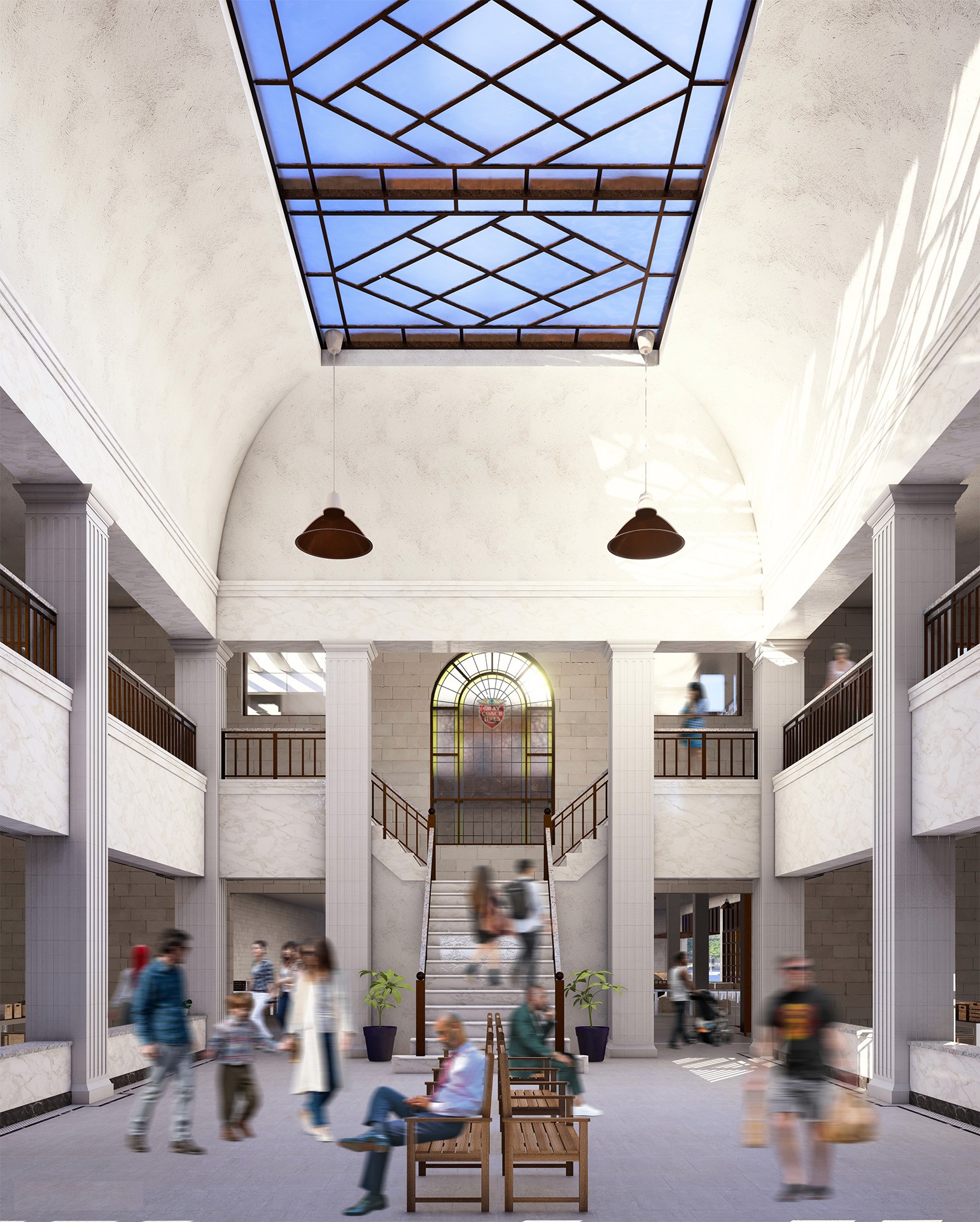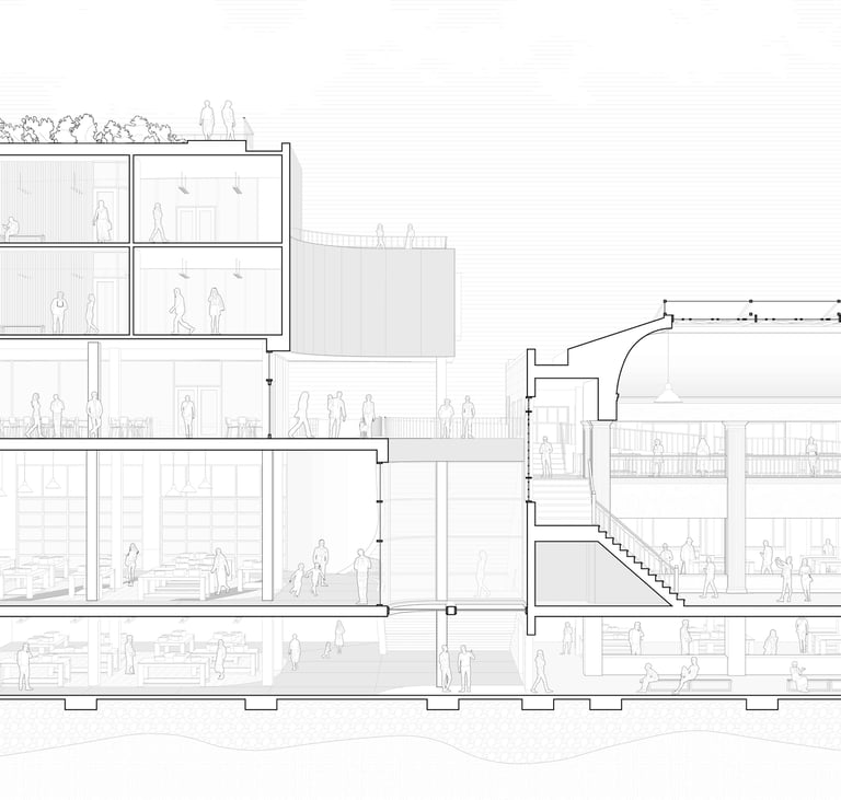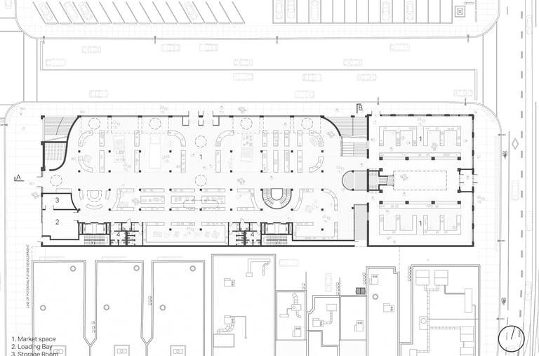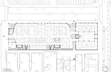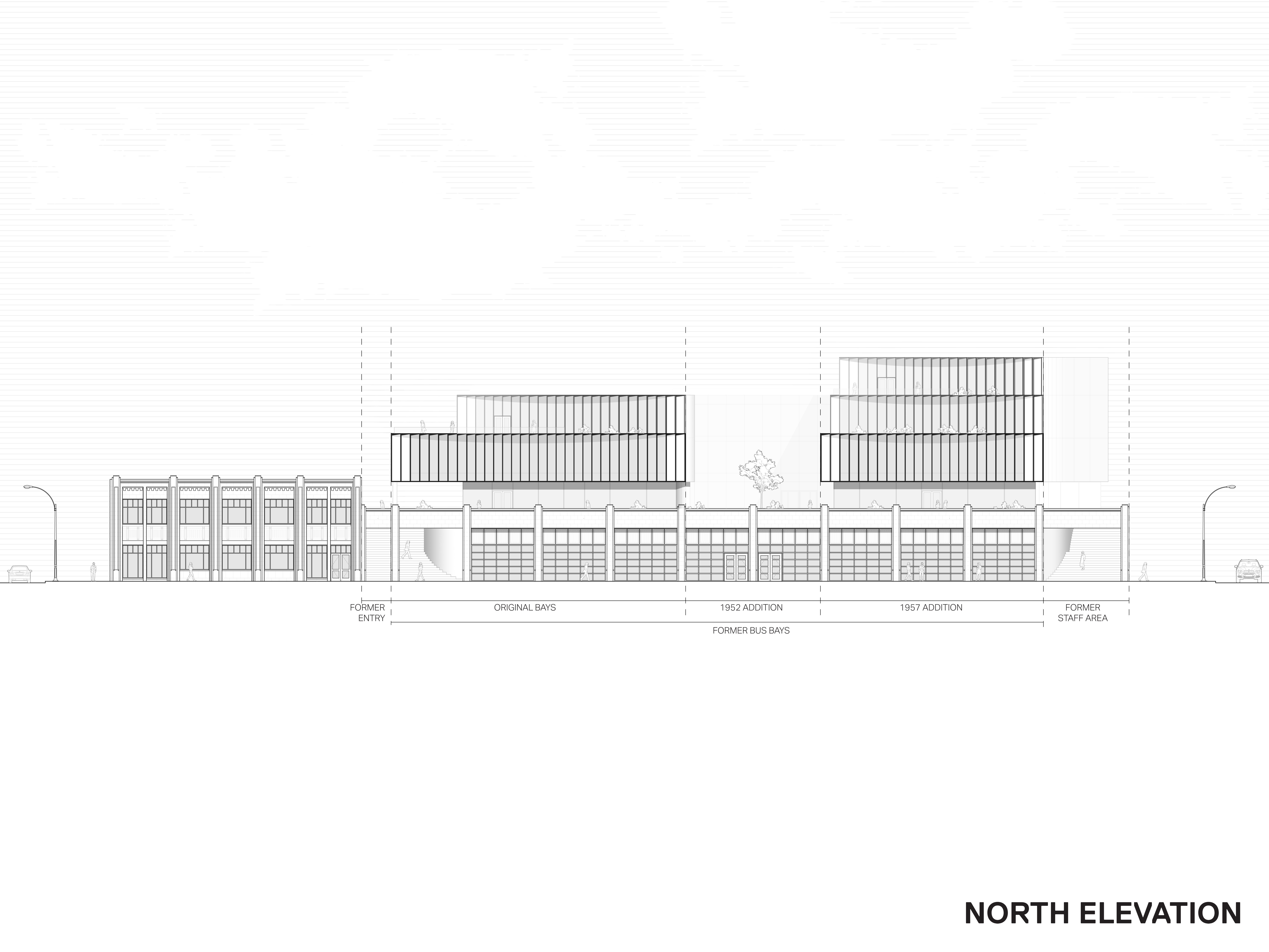 The Gray Coach Terminal conceptualizes a new life for a disused bus station in downtown Toronto. It envisions a lively market place that embraces the original art deco building and bus bays, converting it into an open air, all-season hub of activity. The original circulation paths of buses through the terminal are reflected in the new forms above which house community programming and retail areas, creating a palimpsest of the building's past. The material palette of the addition responds to the site's automotive history and expresses raw aluminum and metal formed into forms which borrow from classic bus designs. The terracing of the rooftop community spaces gently gestures towards the original art-deco terminal building, emphasizing its importance and respecting its conservative scale. The new marketplace utilizes the original bus entries for vendors to unload, and the garage-style doors allow for the market to spill onto the sidewalk in warmer weather. The original stained glass window with ‘Gray Coach’ branding becomes a centerpiece between the old and the new, residing in a lightwell which gives it visibility from the basement up to the roof terrace and spotlights the historical character of the building.