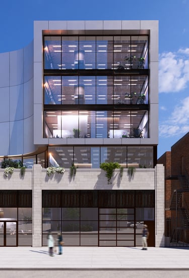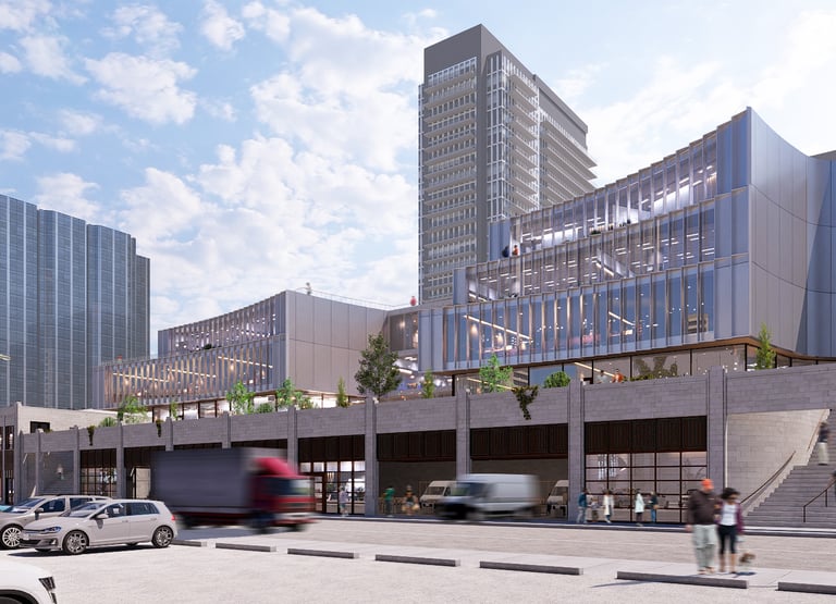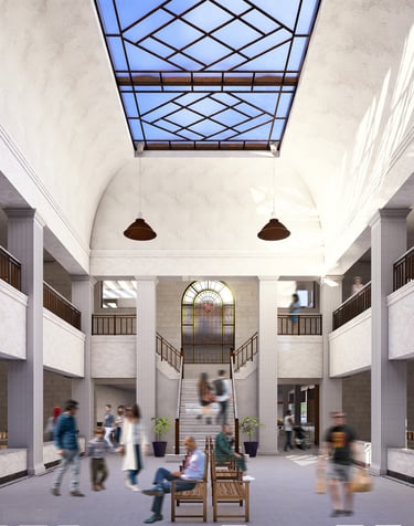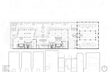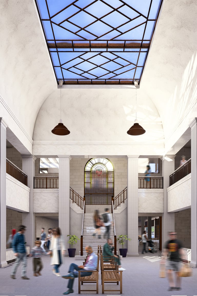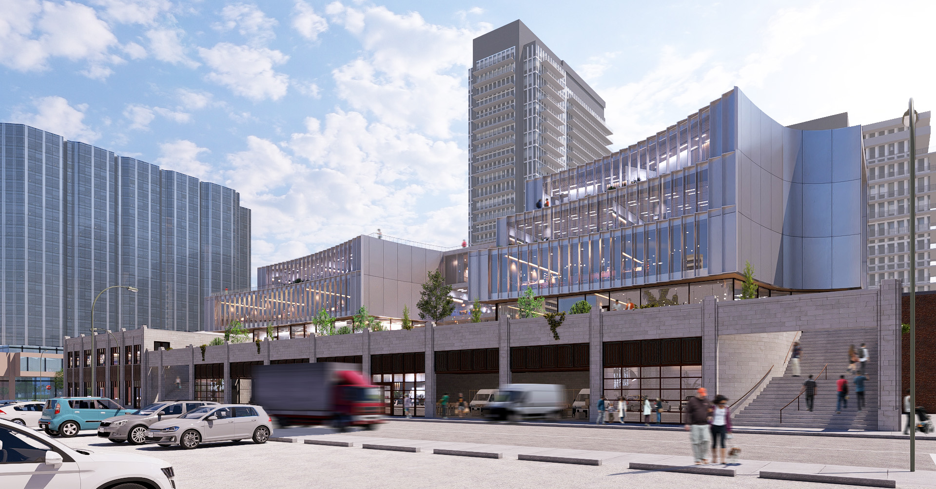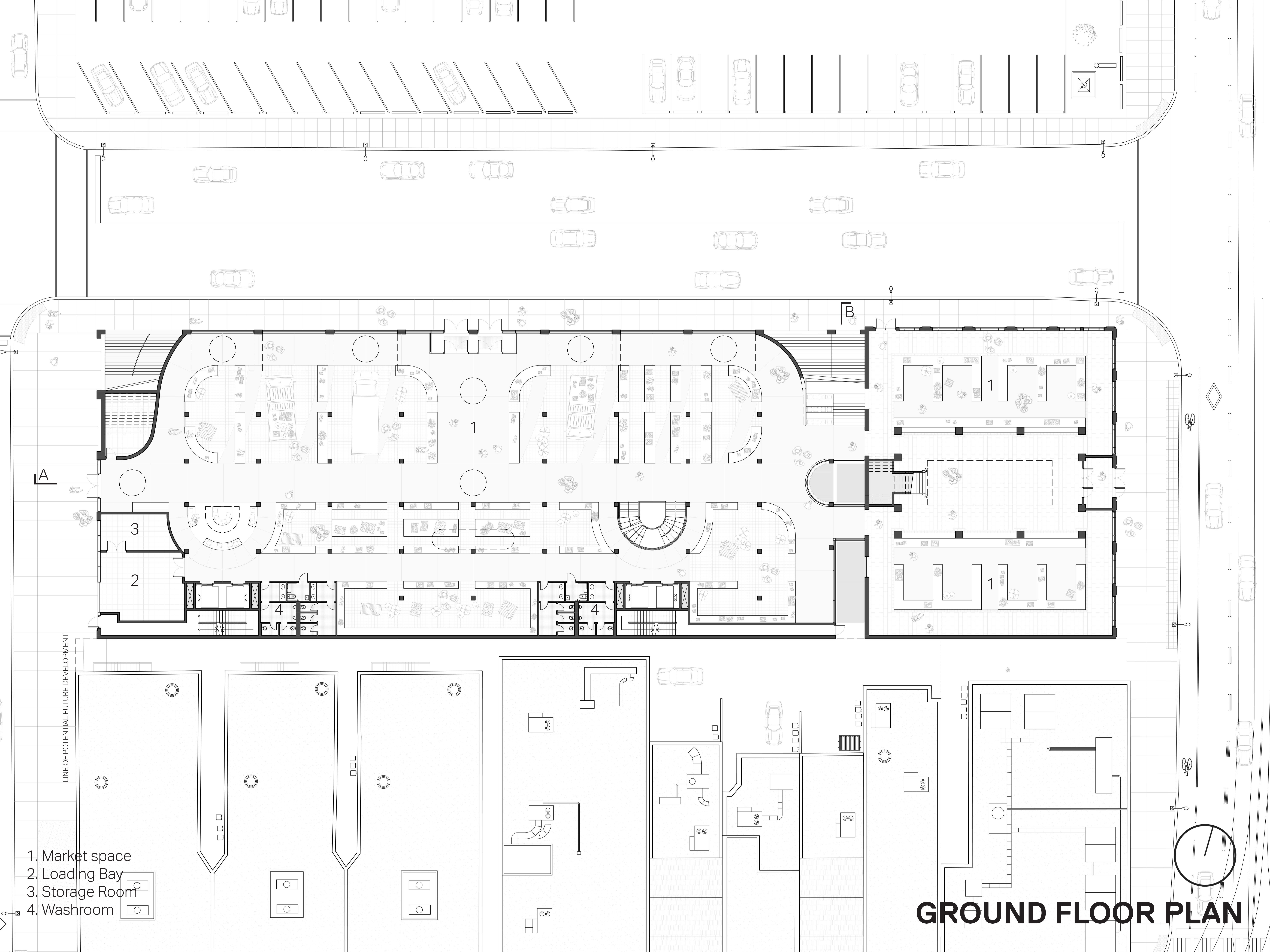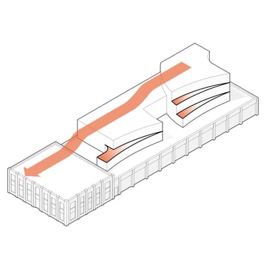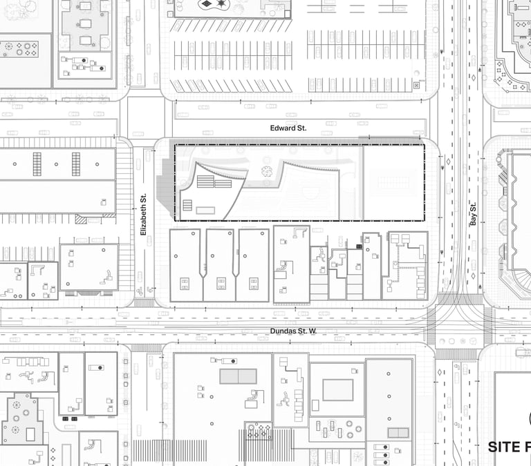The Gray Coach Terminal conceptualizes a new life for a disused bus station in downtown Toronto. It envisions a lively market place that embraces the original art deco building and bus bays, converting it into an open air, all-season hub of activity. The original circulation paths of buses through the terminal are reflected in the new forms above which house community programming and retail areas, creating a palimpsest of the building's past. The material palette of the addition responds to the site's automotive history and expresses raw aluminum and metal formed into forms which borrow from classic bus designs. The terracing of the rooftop community spaces gently gestures towards the original art-deco terminal building, emphasizing its importance and respecting its conservative scale. The new marketplace utilizes the original bus entries for vendors to unload, and the garage-style doors allow for the market to spill onto the sidewalk in warmer weather. The original stained glass window with ‘Gray Coach’ branding becomes a centerpiece between the old and the new, residing in a lightwell which gives it visibility from the basement up to the roof terrace and spotlights the historical character of the building.