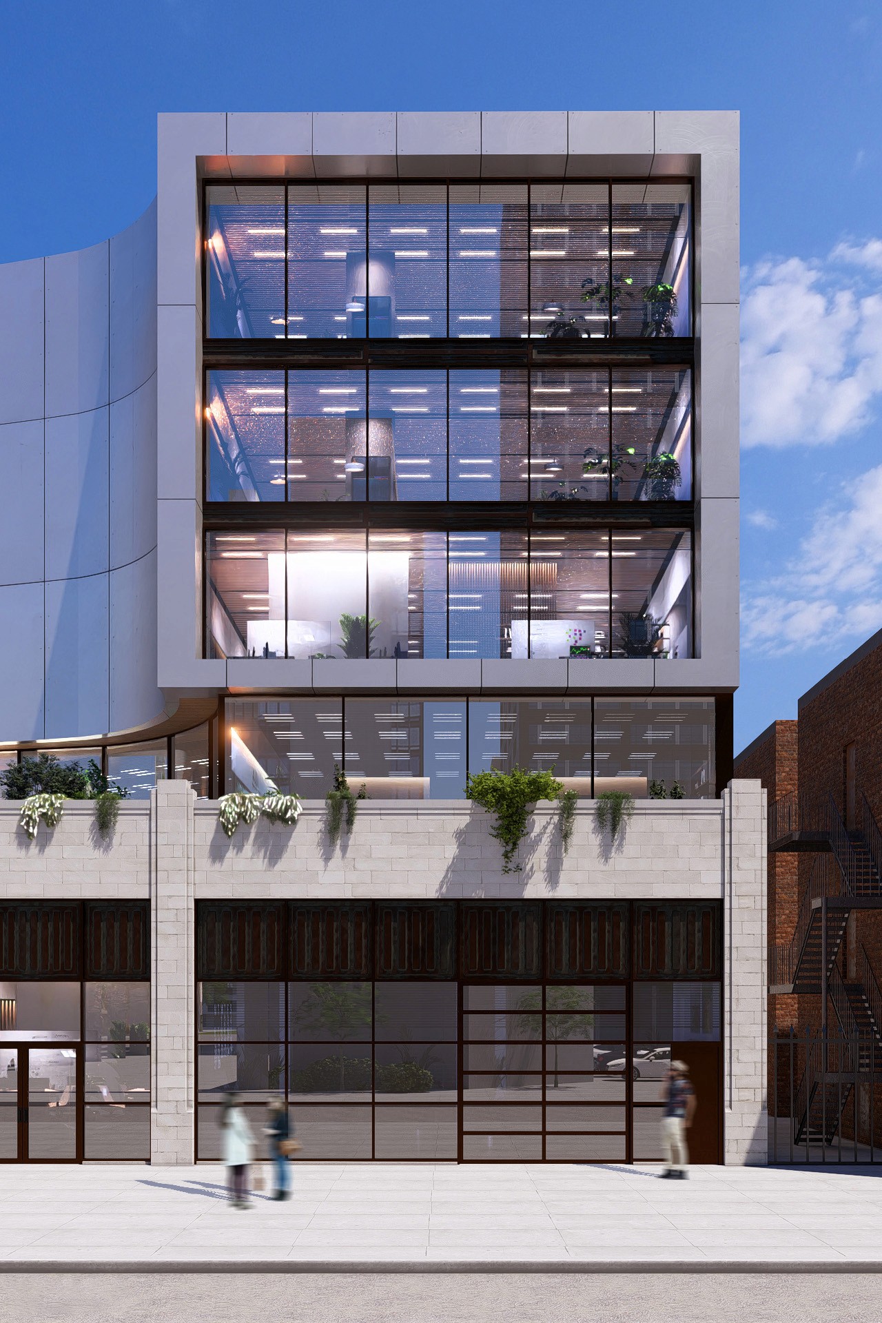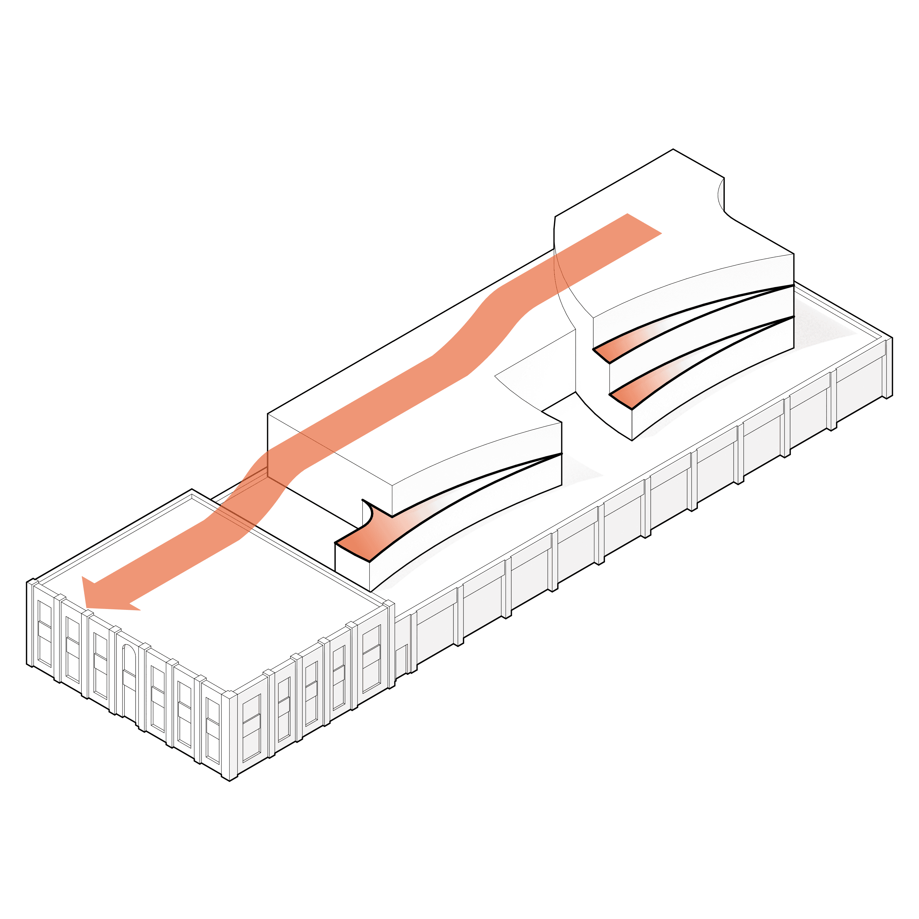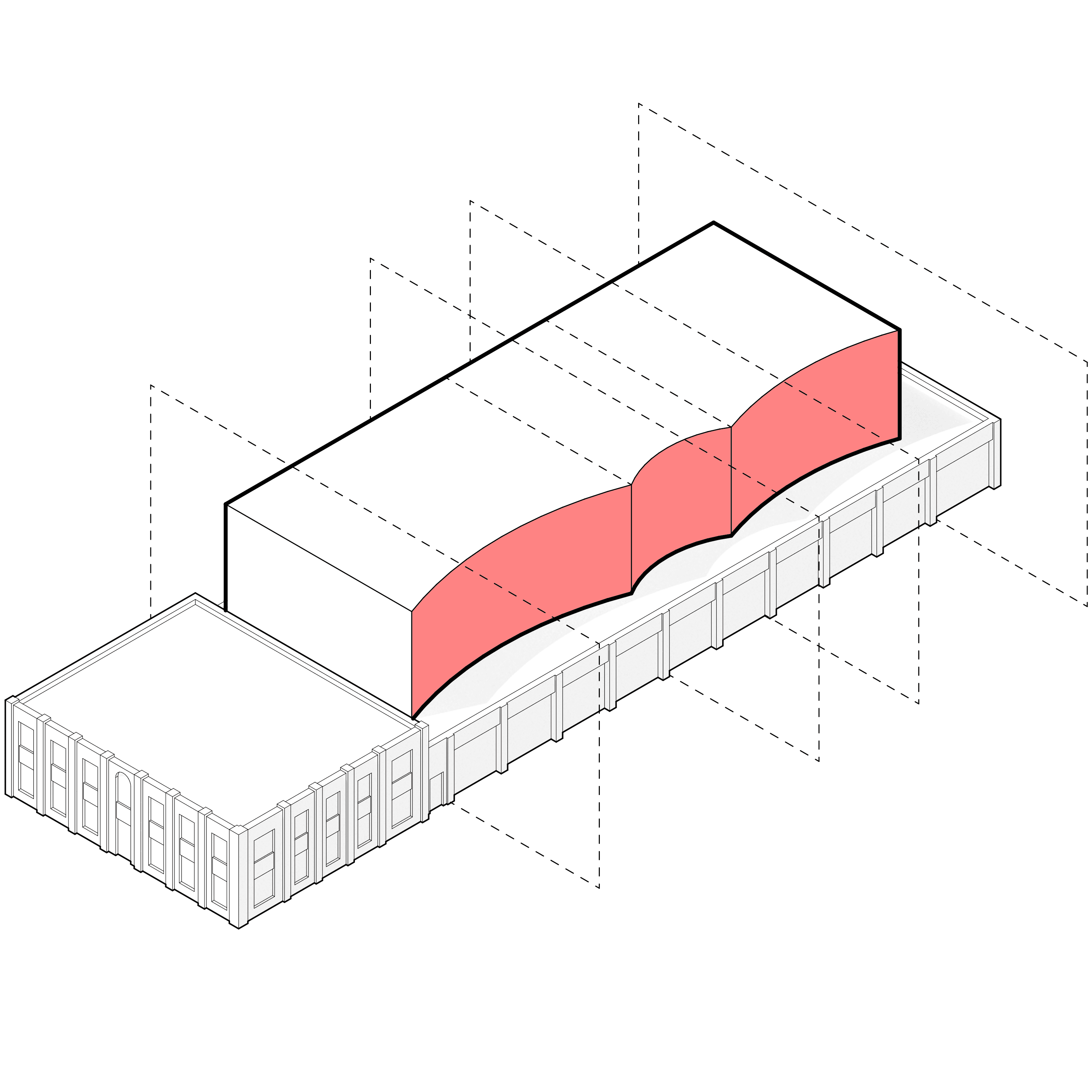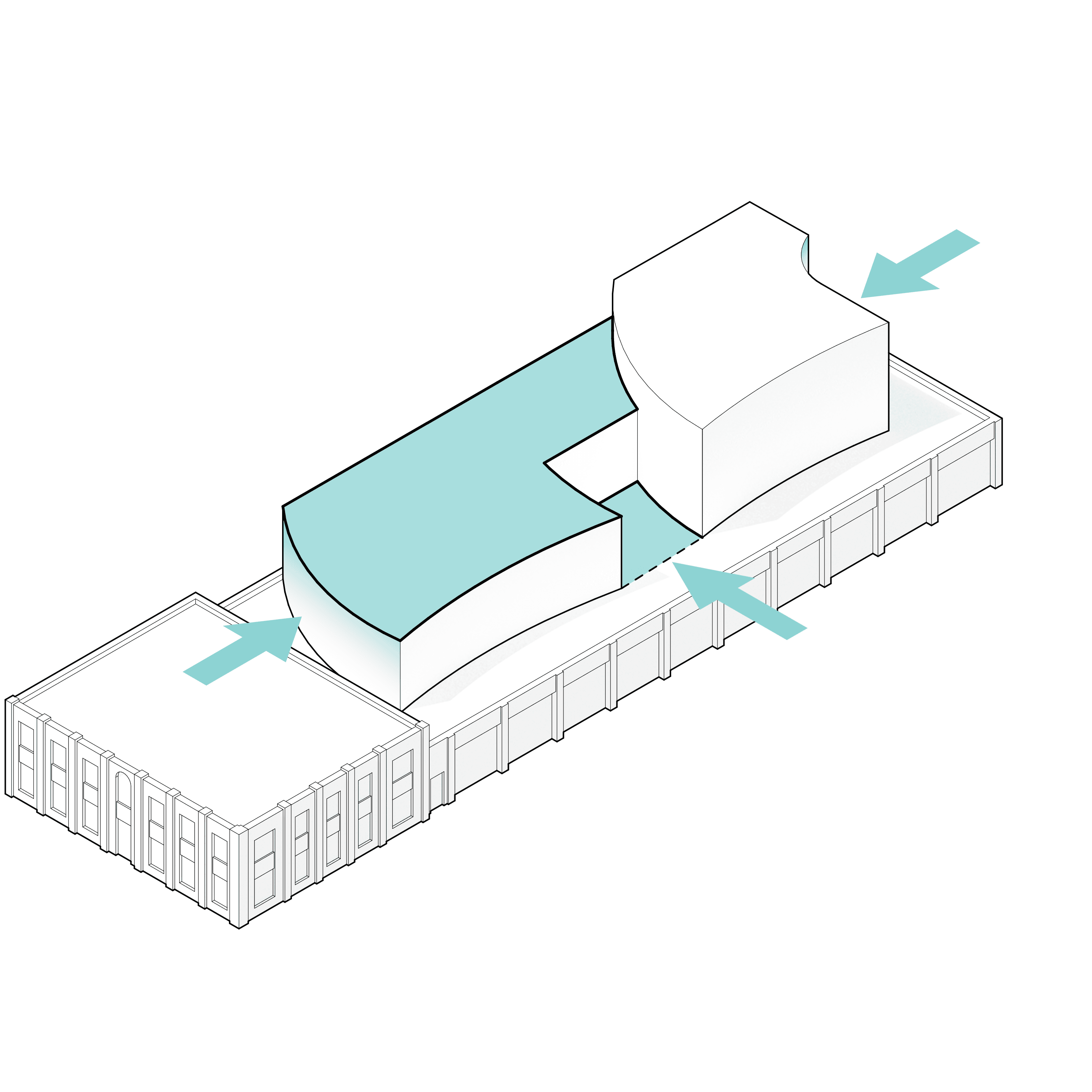 Sculpting the facade to gesture towards the existing building emphasizes its importance on the site and respects its scale.