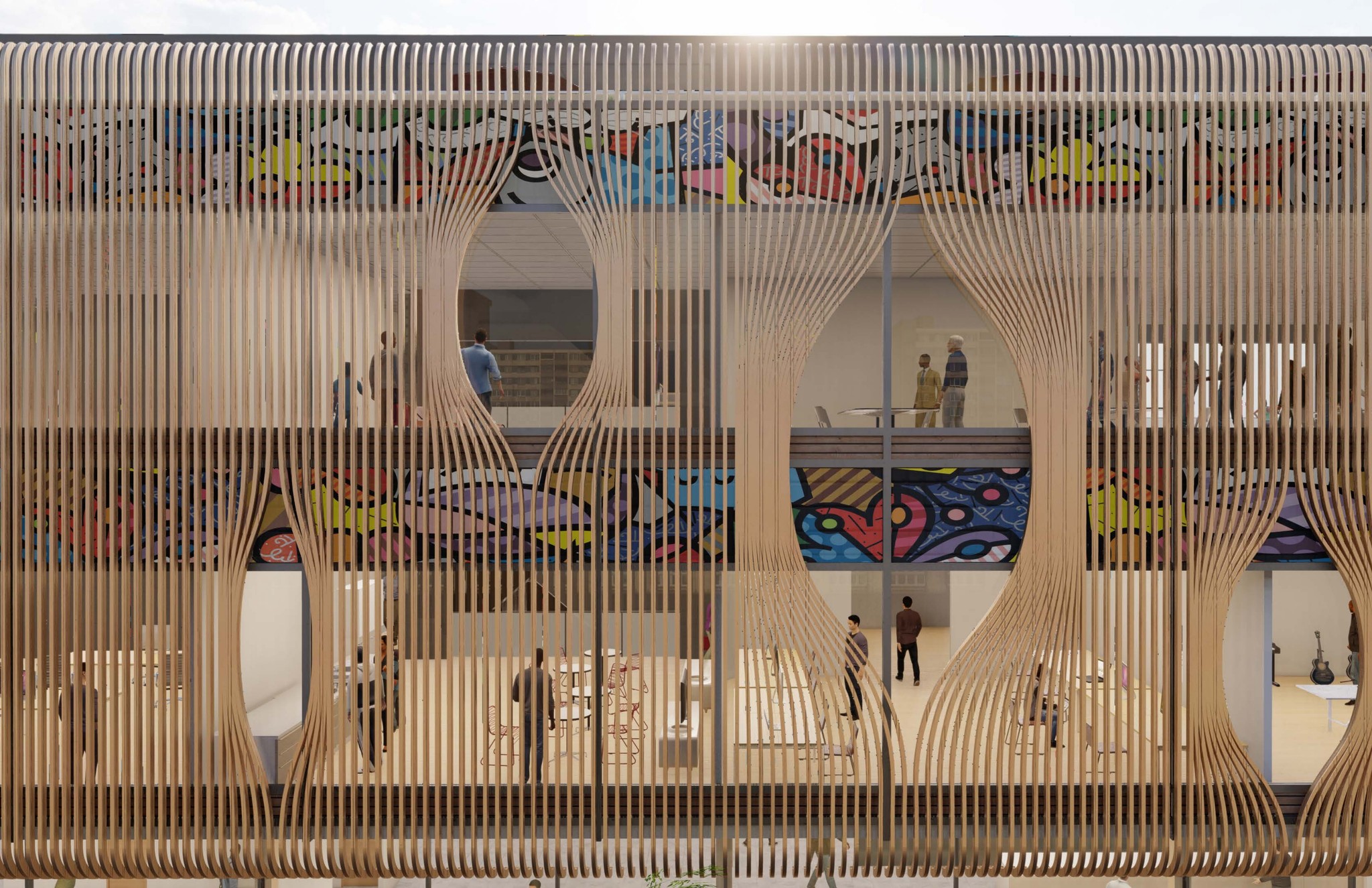 Cutting out portions of the form using the former bus platforms as guiding lines allow for community spaces to be created on multiple levels.