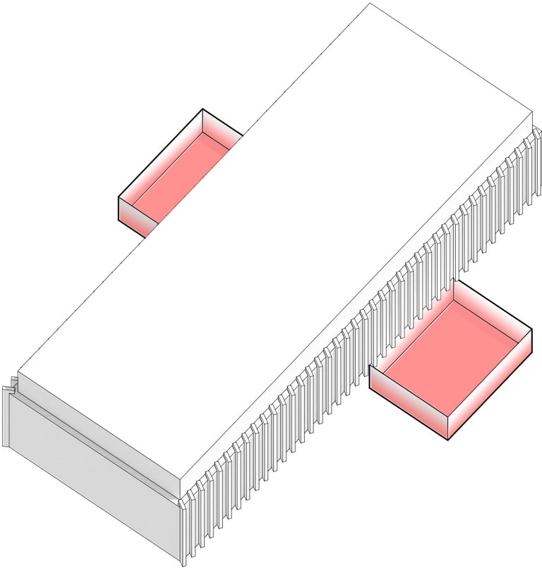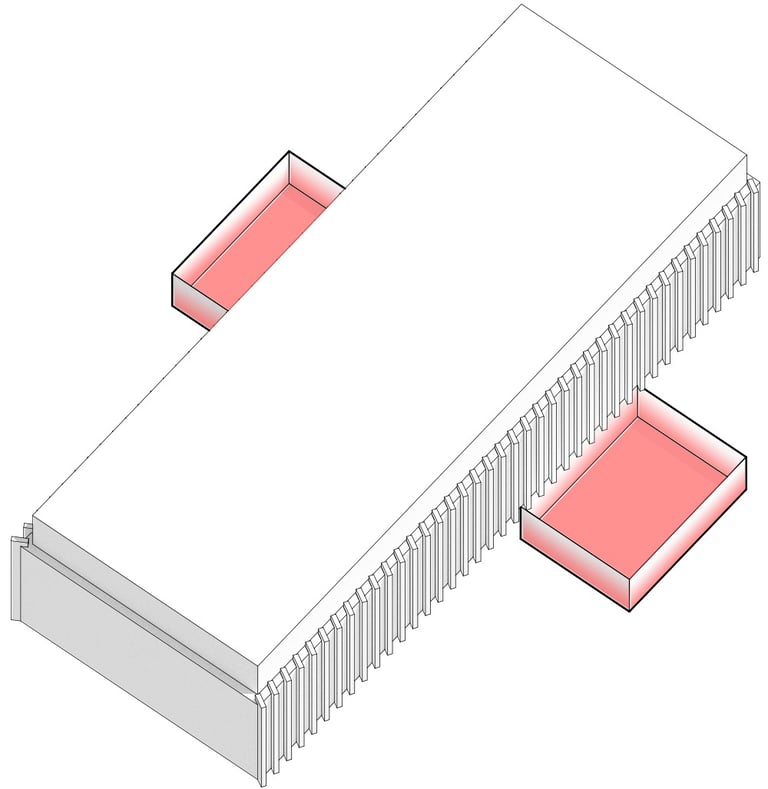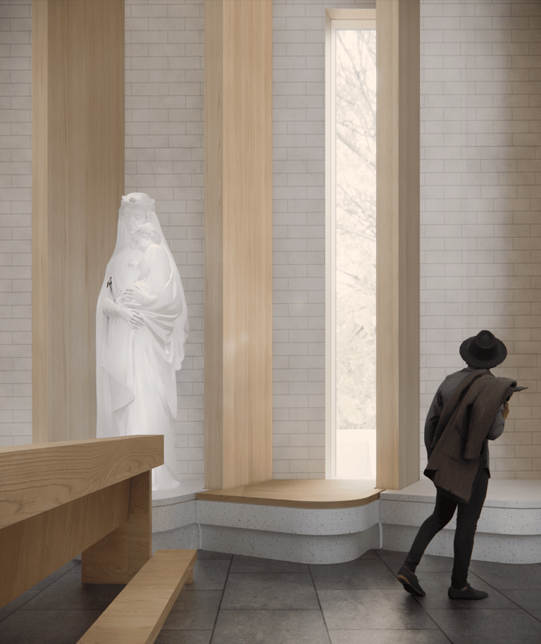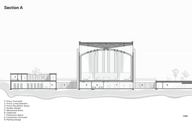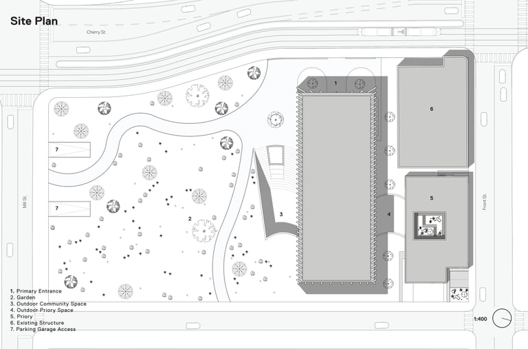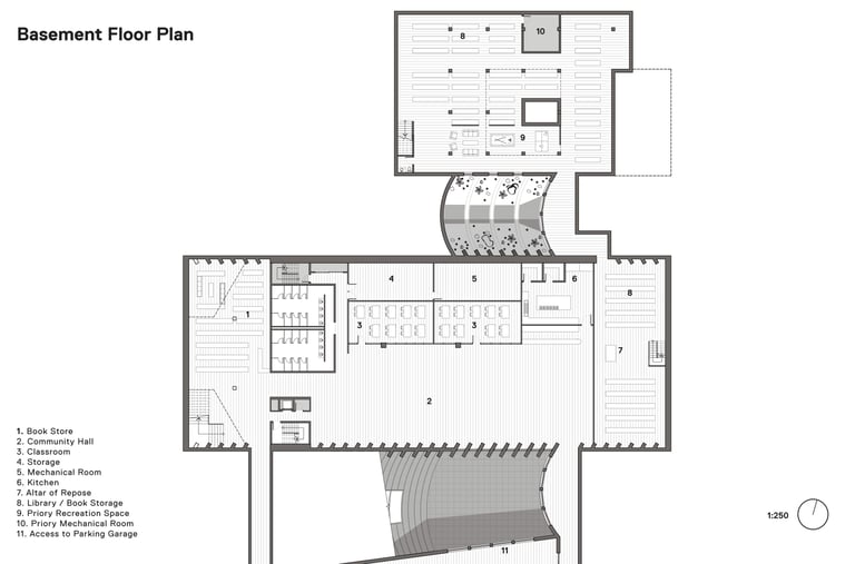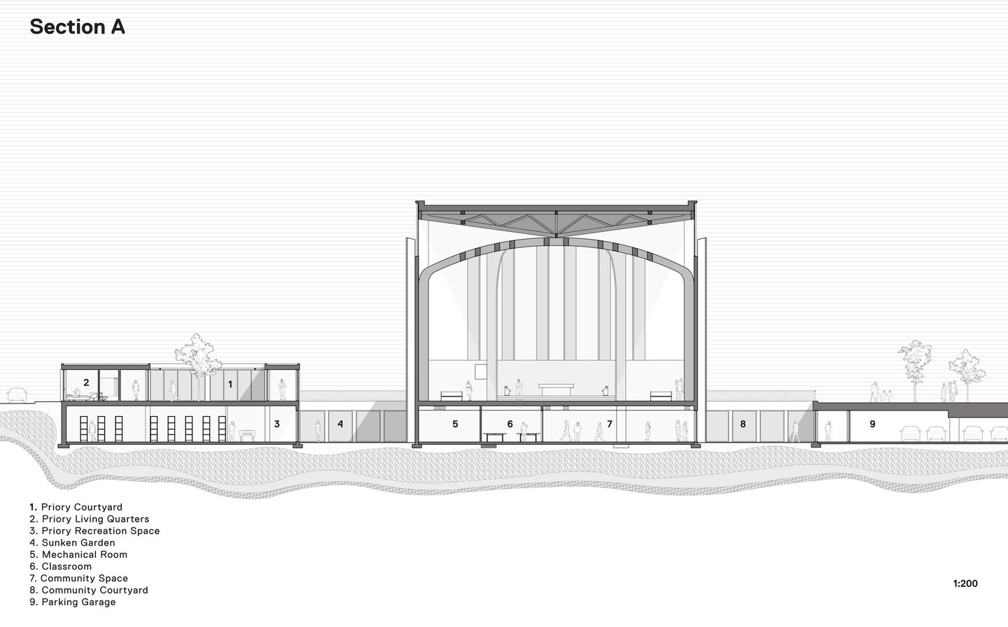 The two wings are recessed into the ground to allow light and exterior access from the adjacent priory and community spaces.