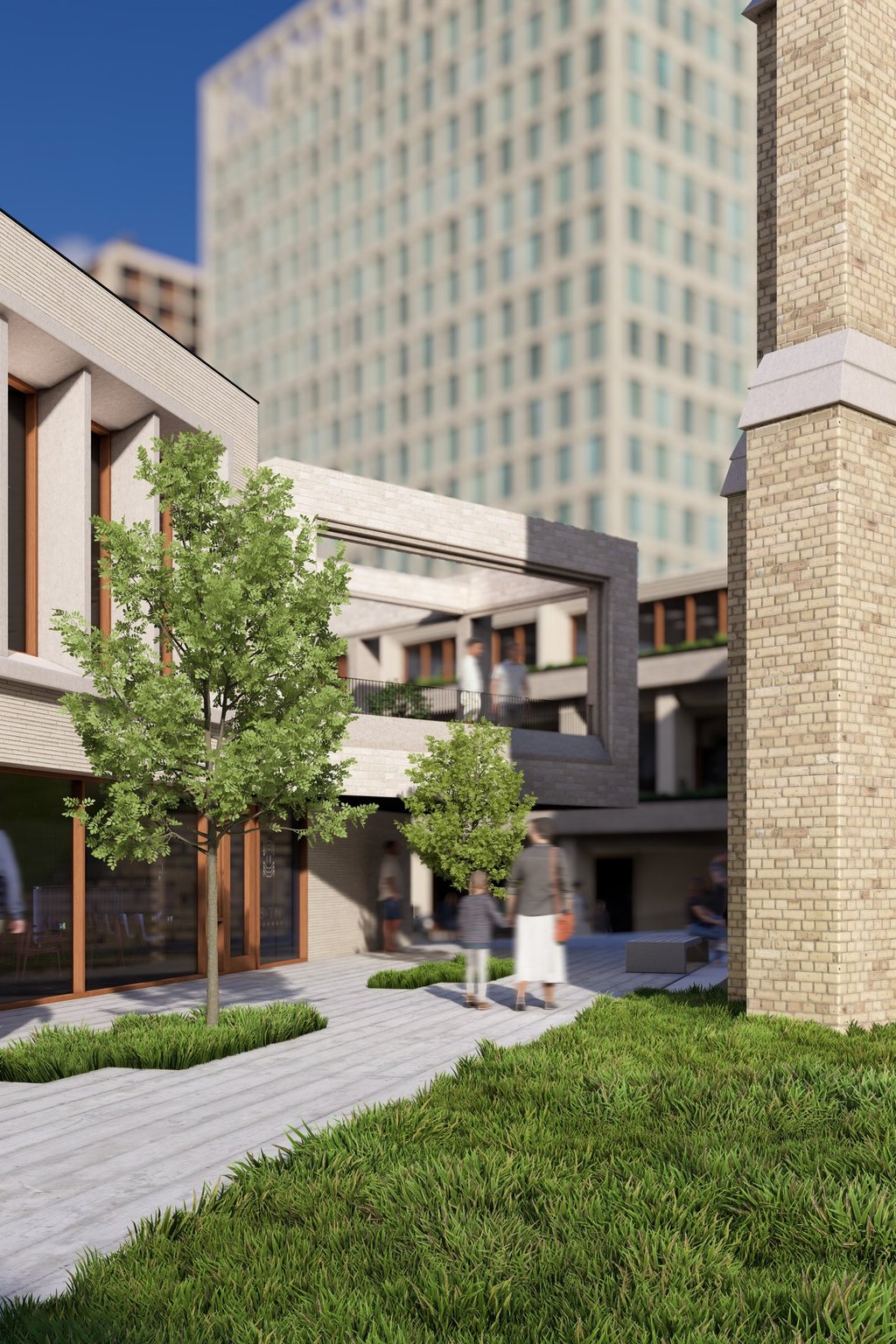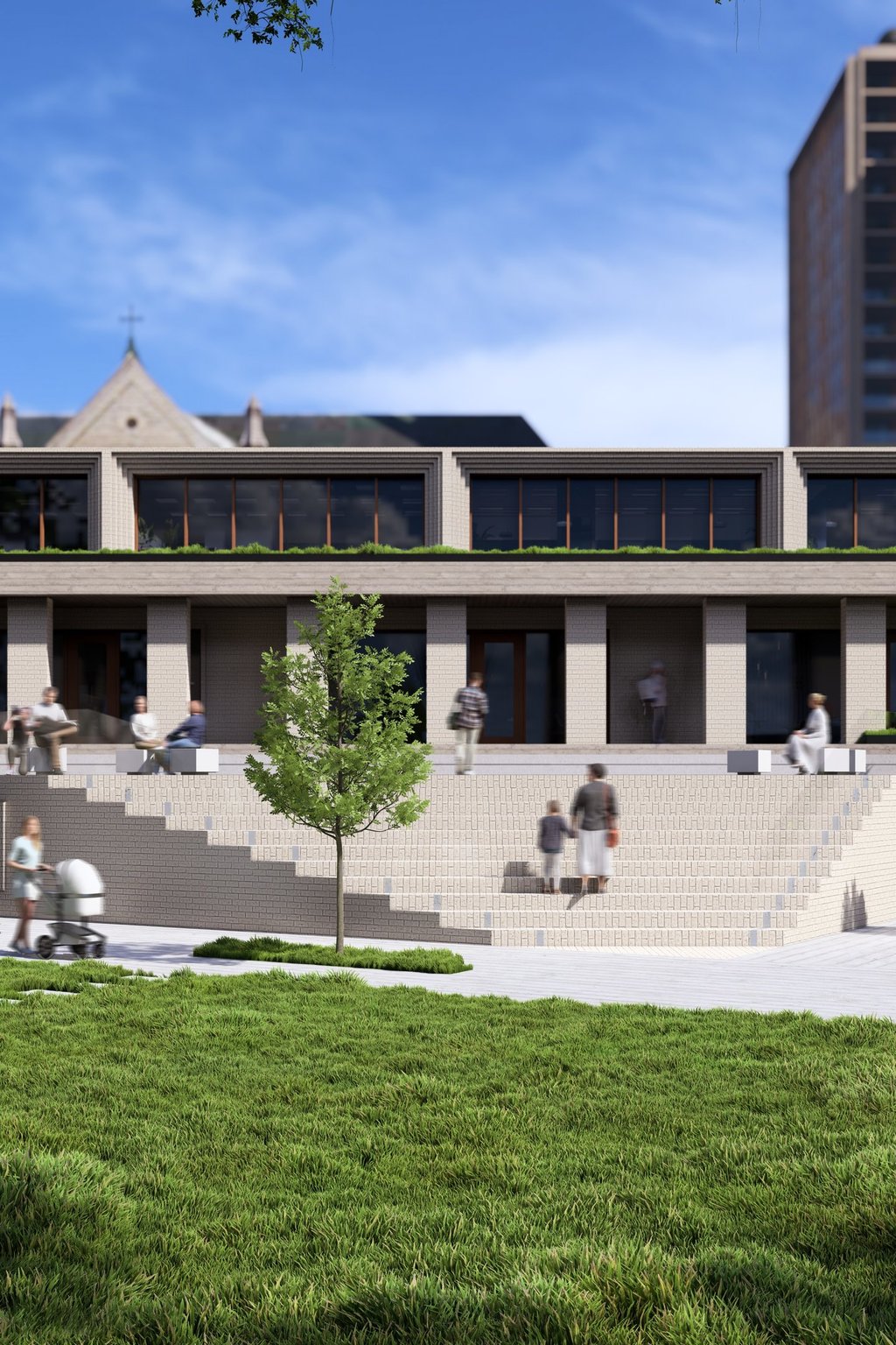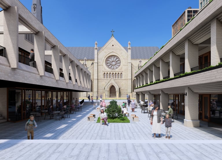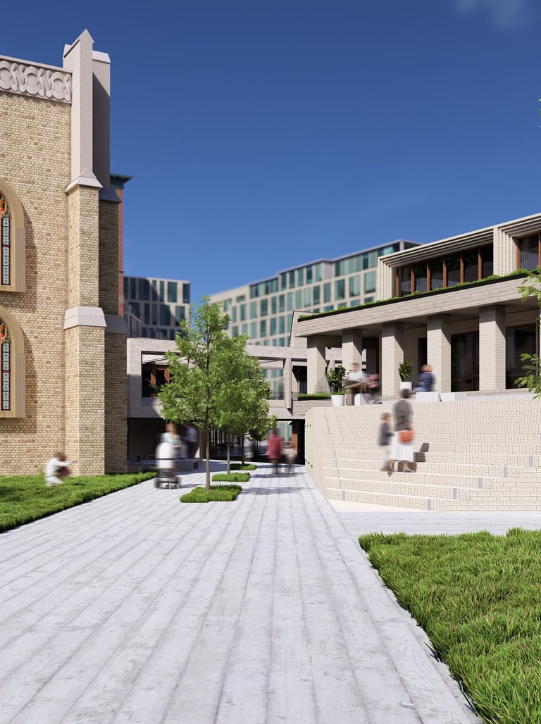 Separating the new form on the site creates a central pedestrian square looking outwards towards the two adjacent churches.