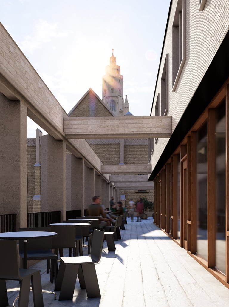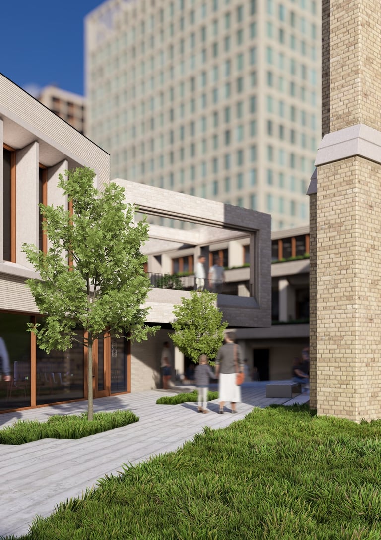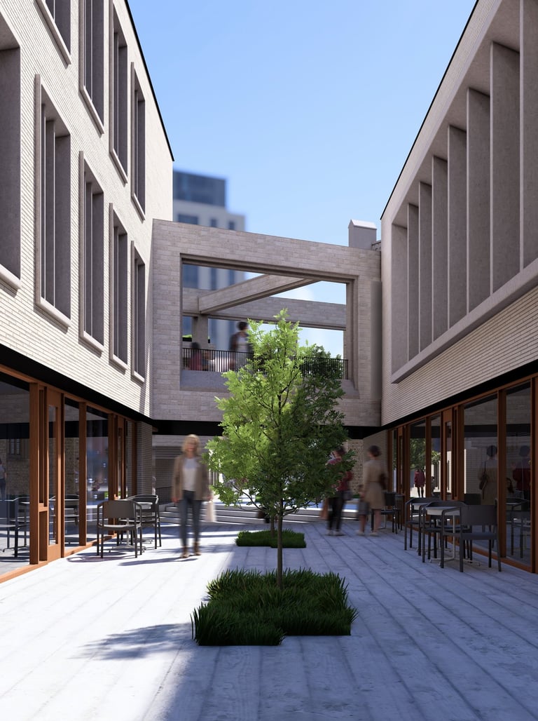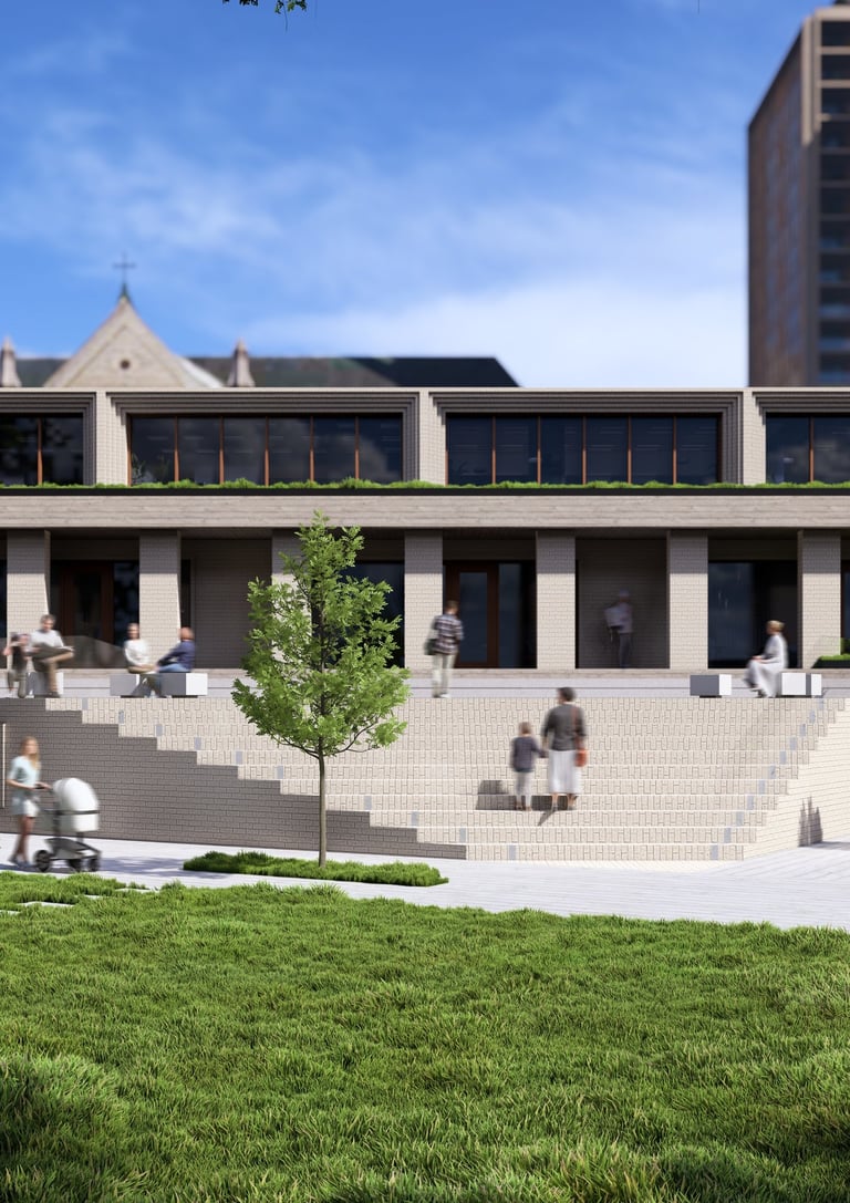 Separating the new form on the site creates a central pedestrian square looking outwards towards the two adjacent churches.
