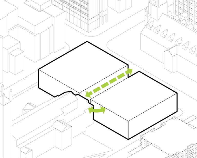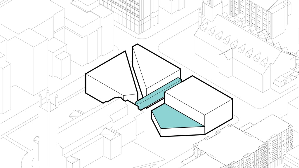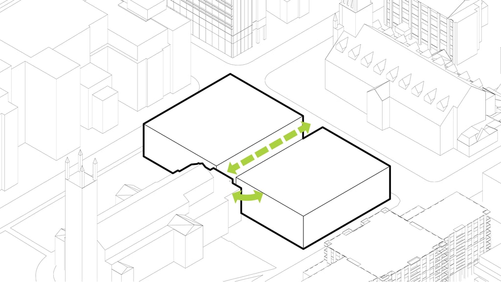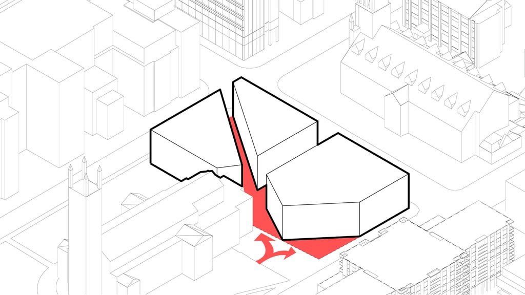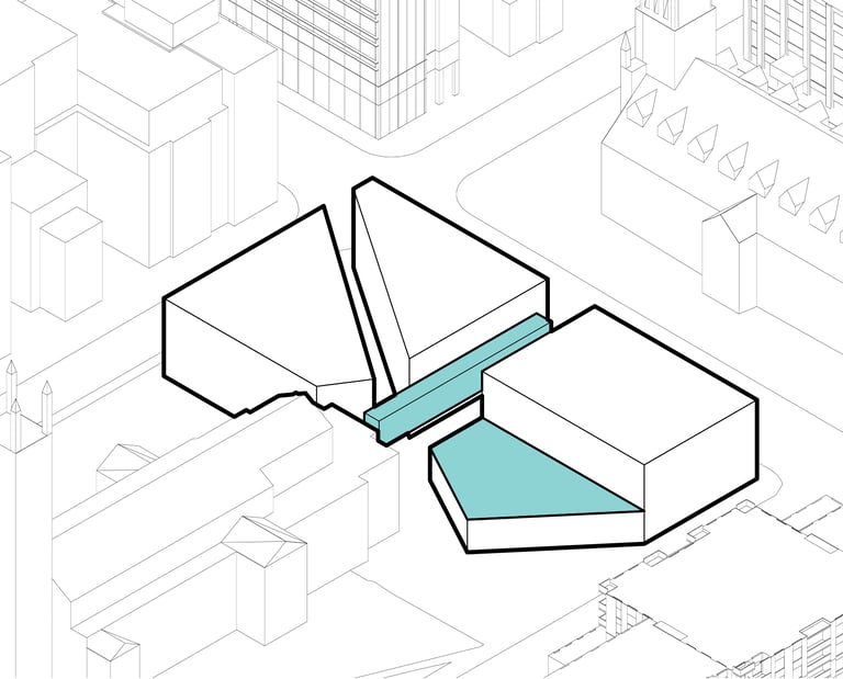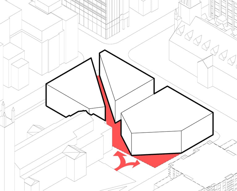 The size and position of the existing parking lot of United Church allowed for a drastic intervention to take place on the site, but it had to be approached sensitively to respect the historical significance of the area. The church remained the central focus of the site, with any new intervention designed to respect its scale and materiality. The dialogue between St. Michael’s Cathedral and the United Church was a unique condition that held the potential to create a captivating moment within the space situated between them. Furthermore, the existing circulation in and around the site was leveraged to better engage with the pedestrian realm. The site's proximity to Yonge Street and its dense commercial strip sees significant pedestrian use, and this relationship offered an opportunity to draw people inward and activate the space.