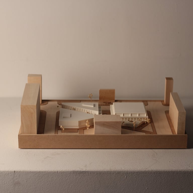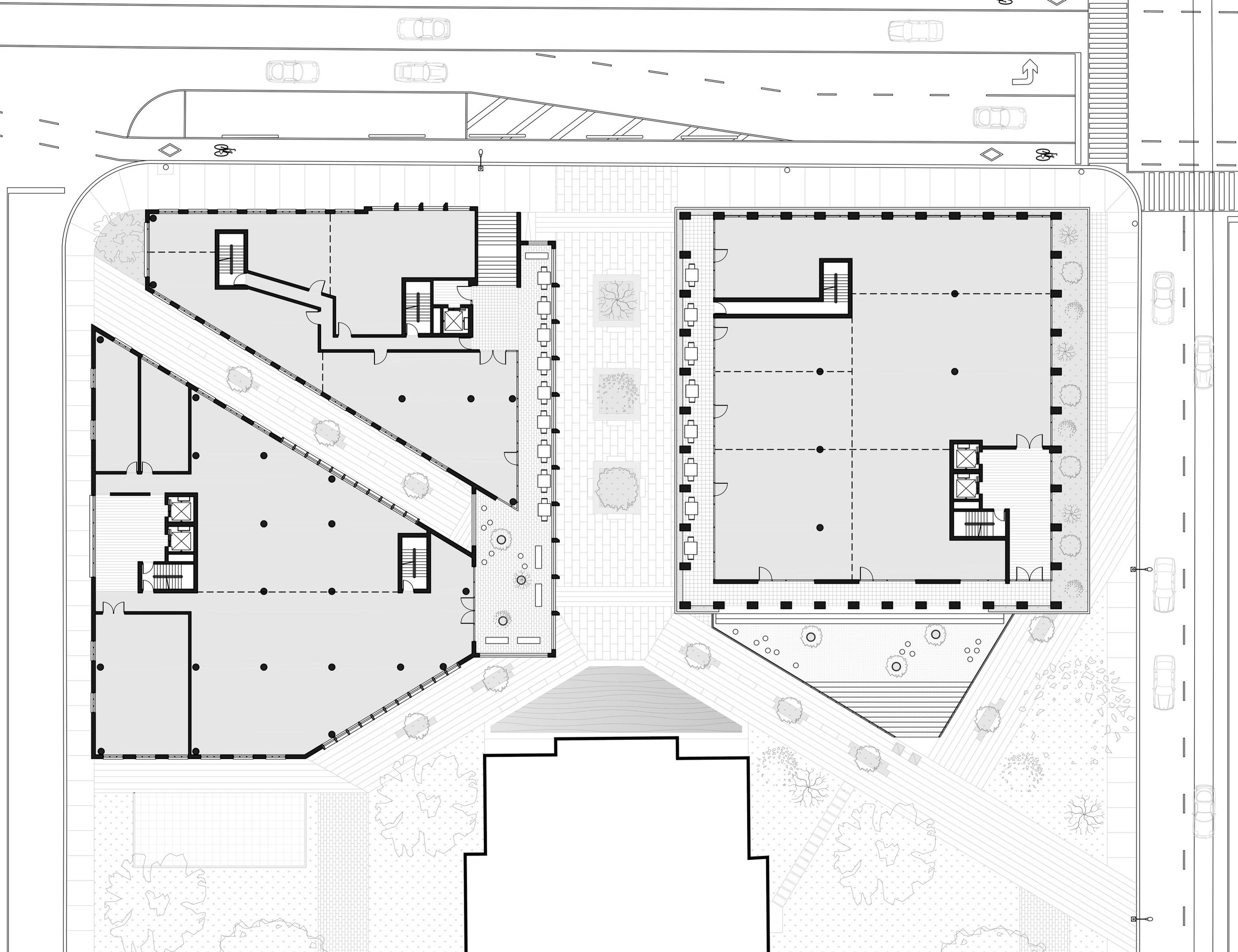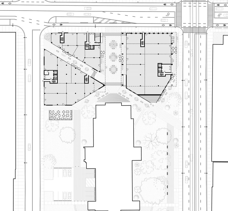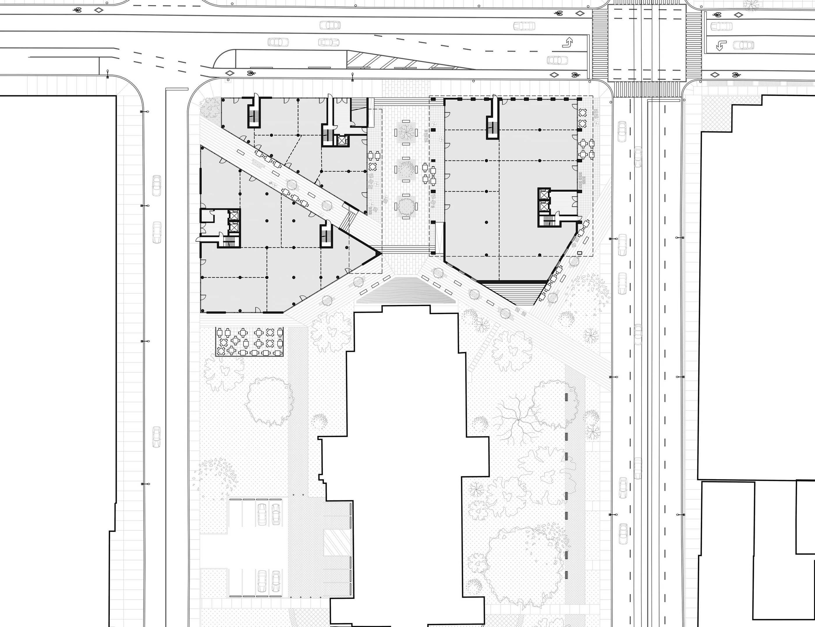 The size and position of the existing parking lot of United Church allowed for a drastic intervention to take place on the site, but it had to be approached sensitively to respect the historical significance of the area. The church remained the central focus of the site, with any new intervention designed to respect its scale and materiality. The dialogue between St. Michael’s Cathedral and the United Church was a unique condition that held the potential to create a captivating moment within the space situated between them. Furthermore, the existing circulation in and around the site was leveraged to better engage with the pedestrian realm. The site's proximity to Yonge Street and its dense commercial strip sees significant pedestrian use, and this relationship offered an opportunity to draw people inward and activate the space.