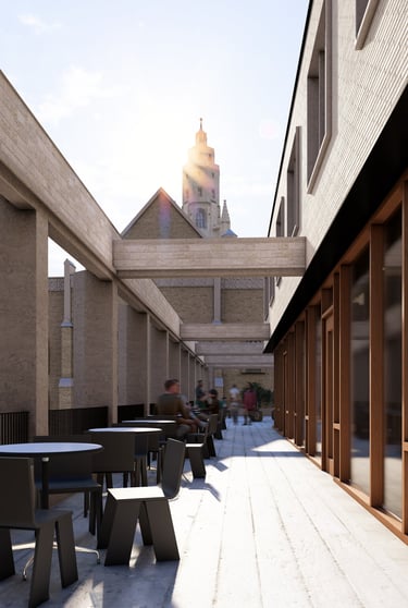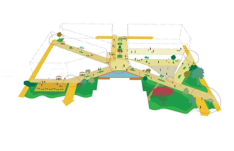 Creating elevated pedestrian spaces throughout the site allow for unique views of the churches and improve accessibility to upper levels.
