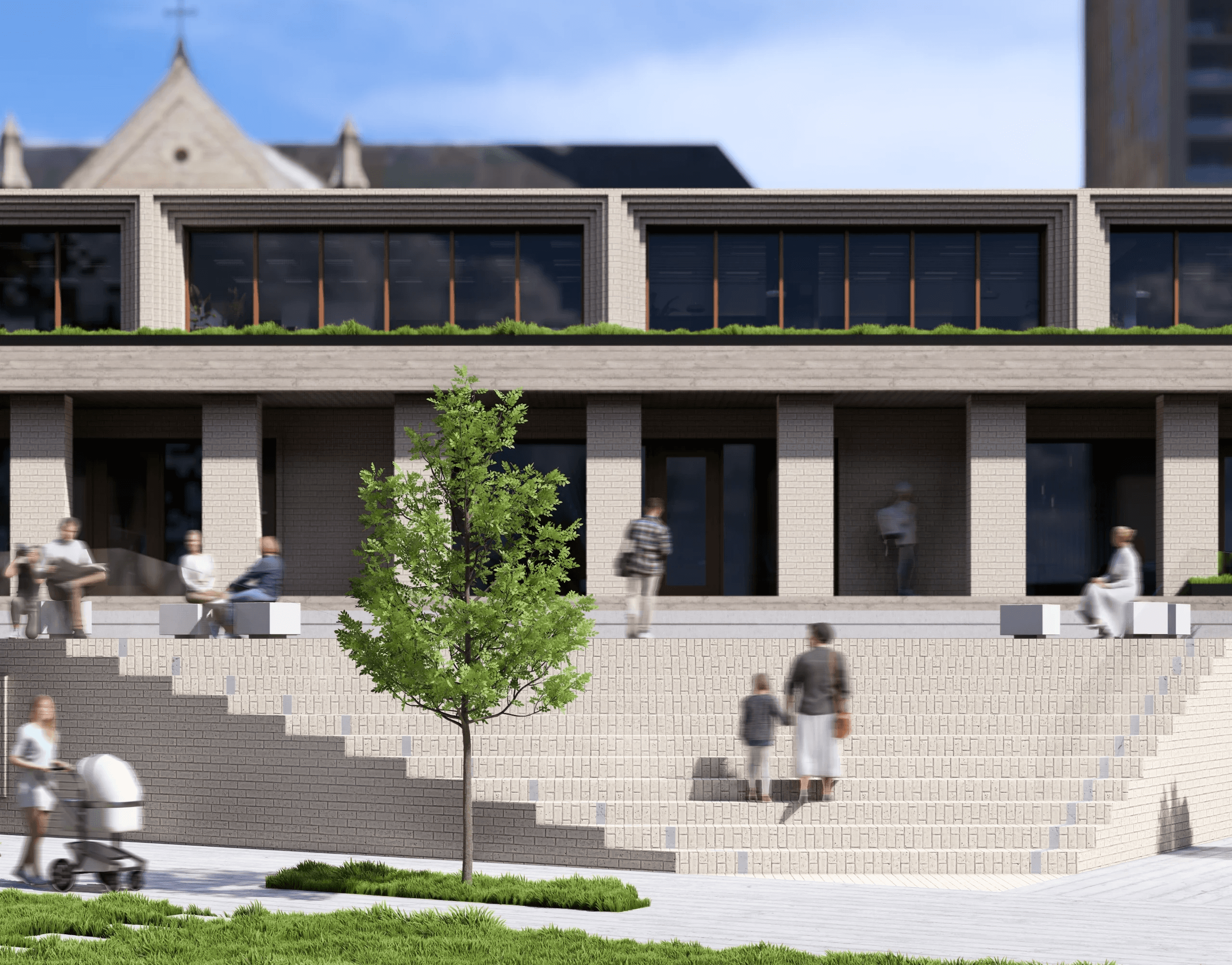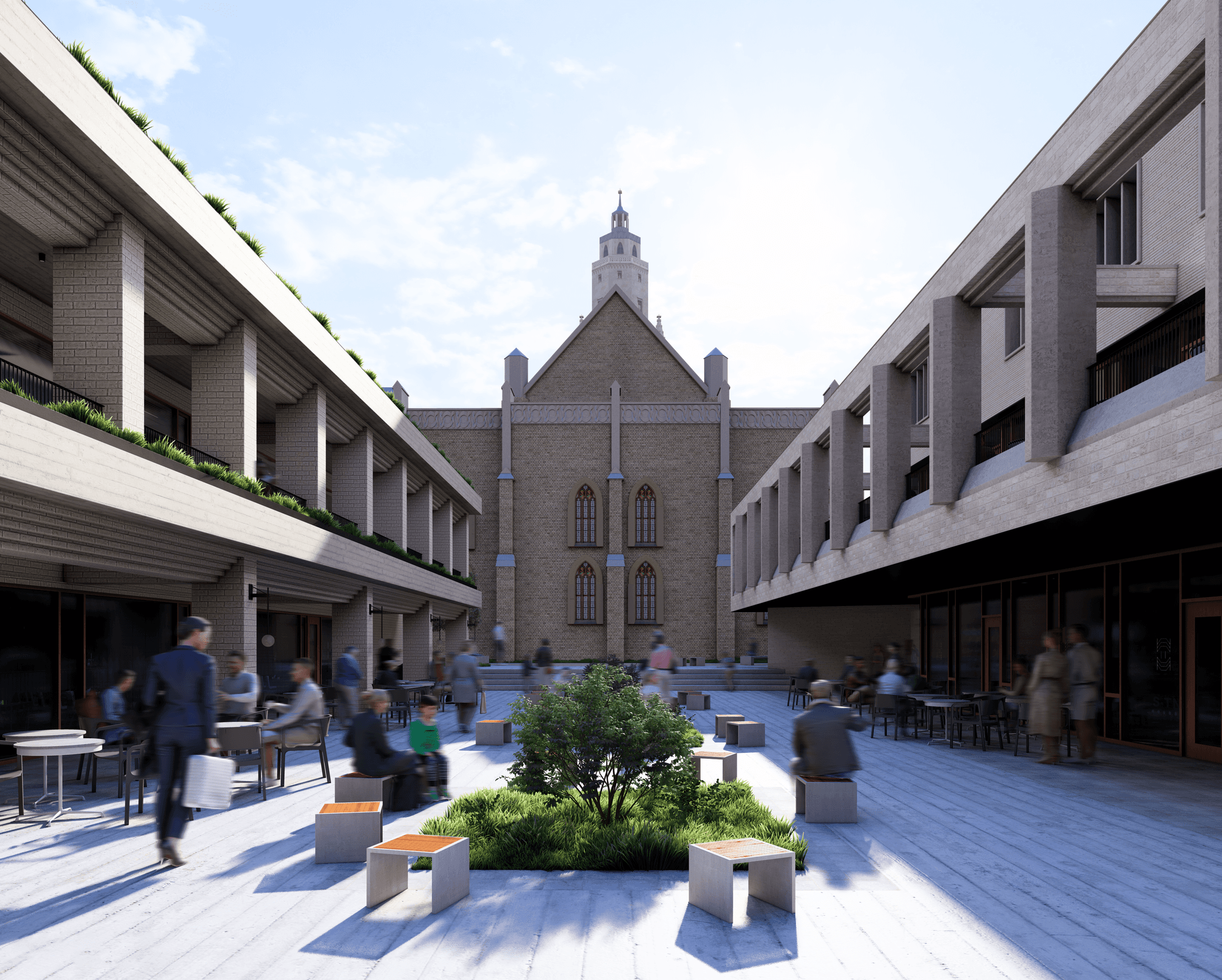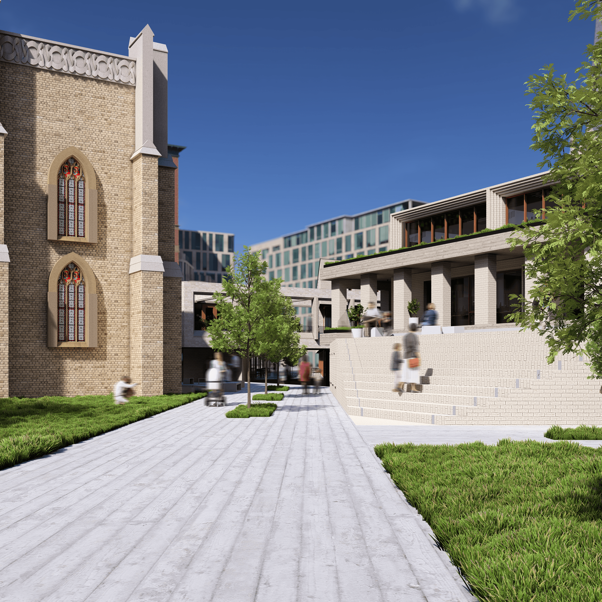 The central pedestrian space is lowered to assert the importance of the church, in a dynamic which mirrors the stairs of the altar which lies beyond the rear wall. A raised pedestrian space creates a unique perspective of the church, framing views of its rear facade and tower beyond.