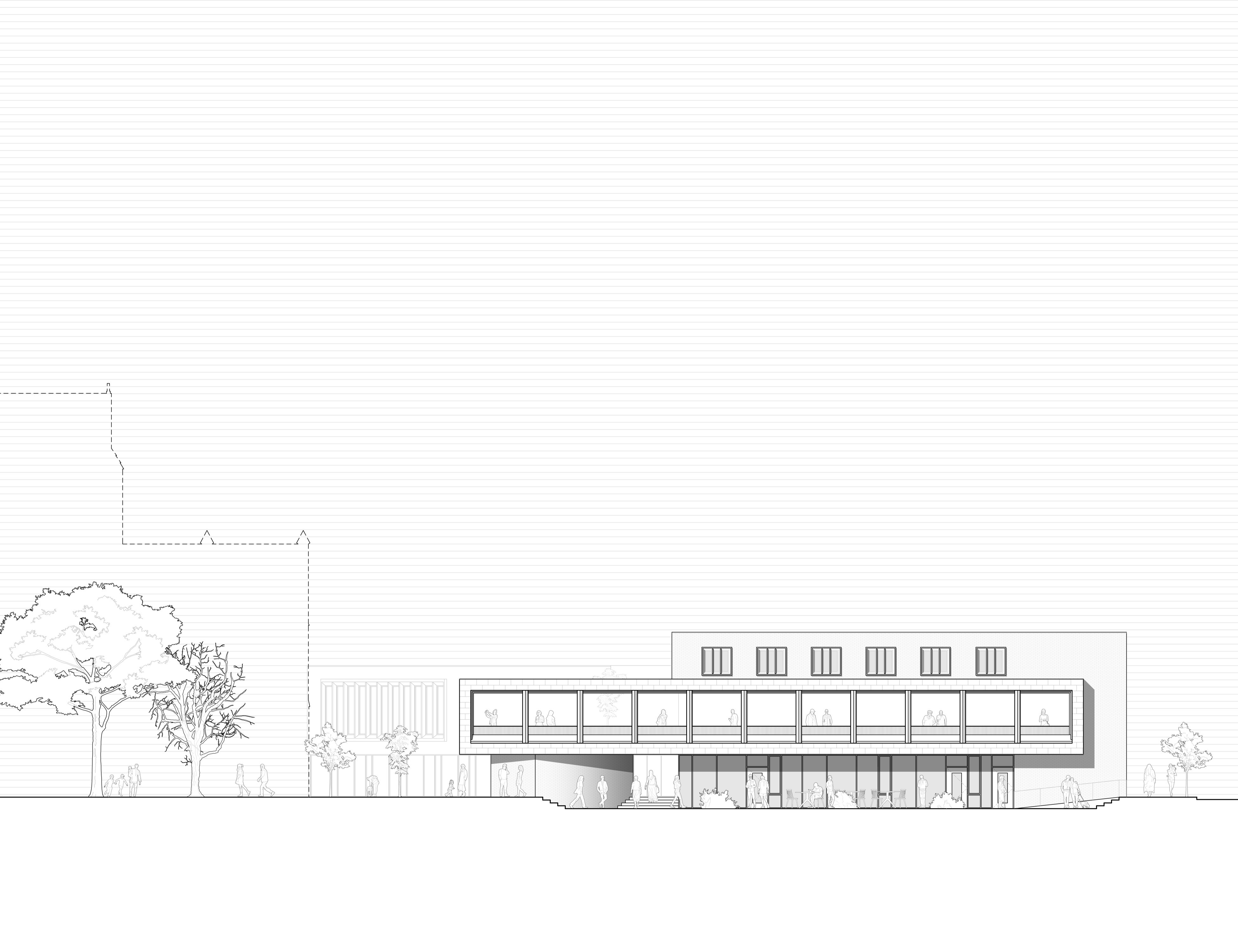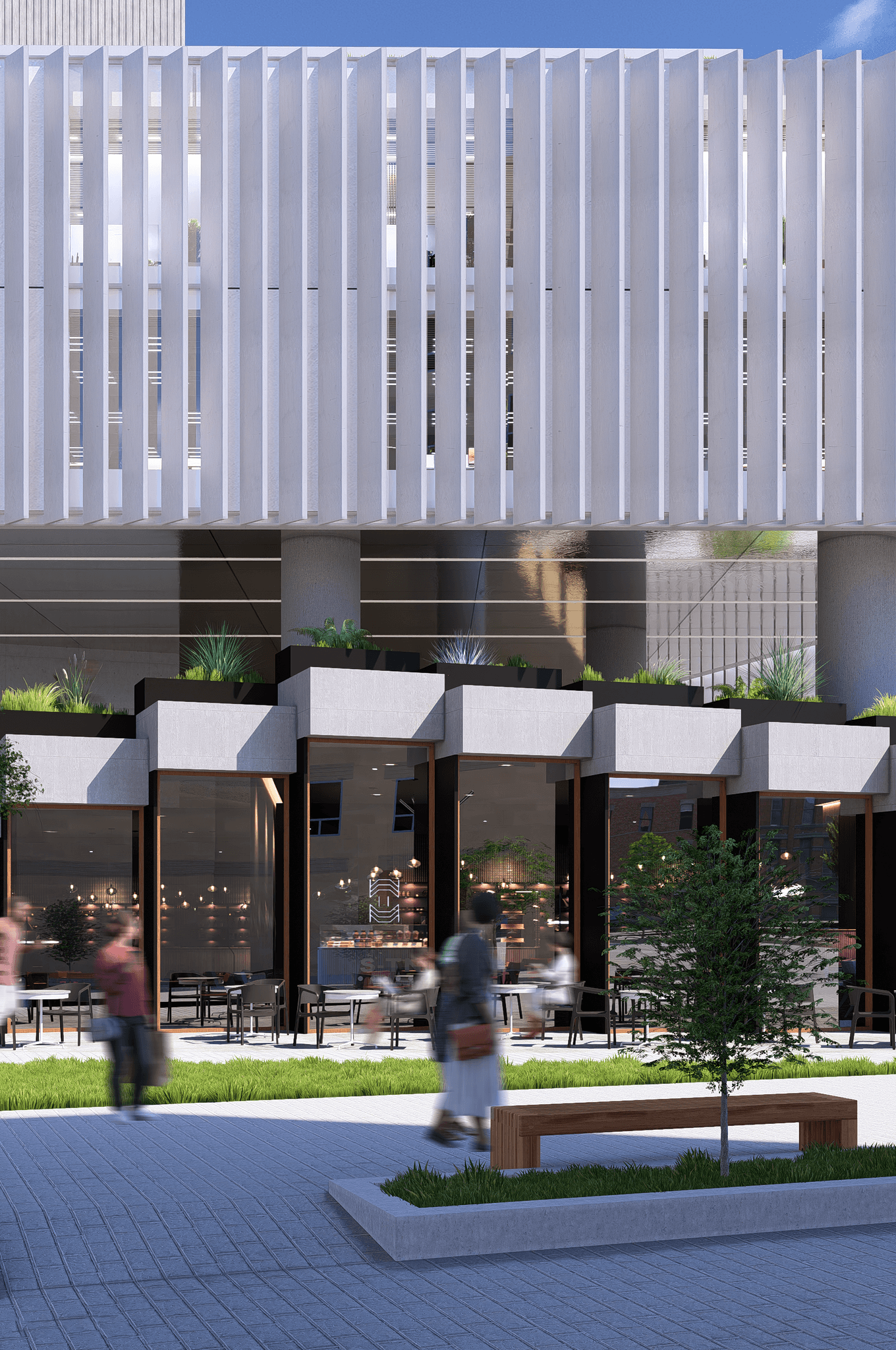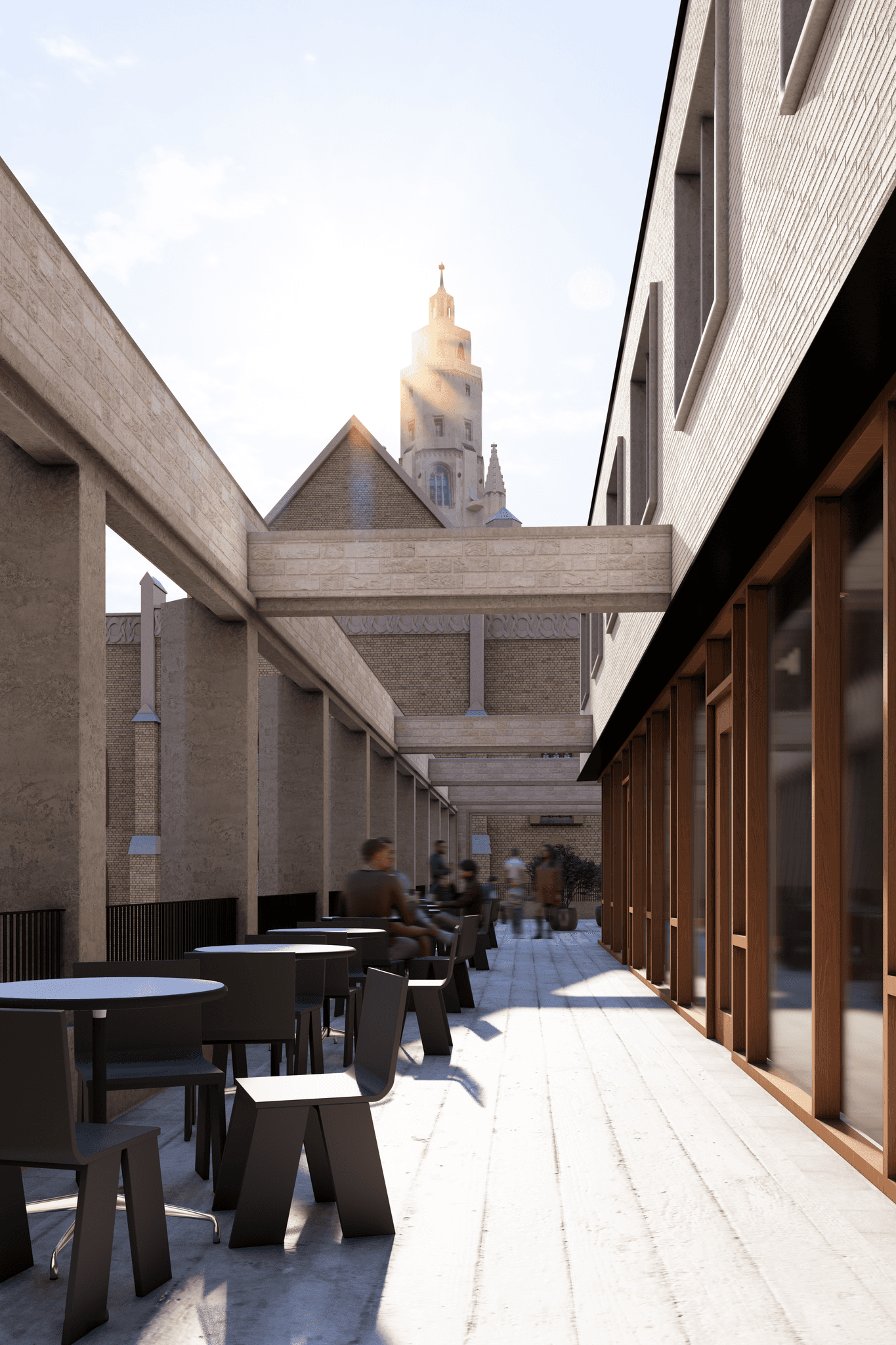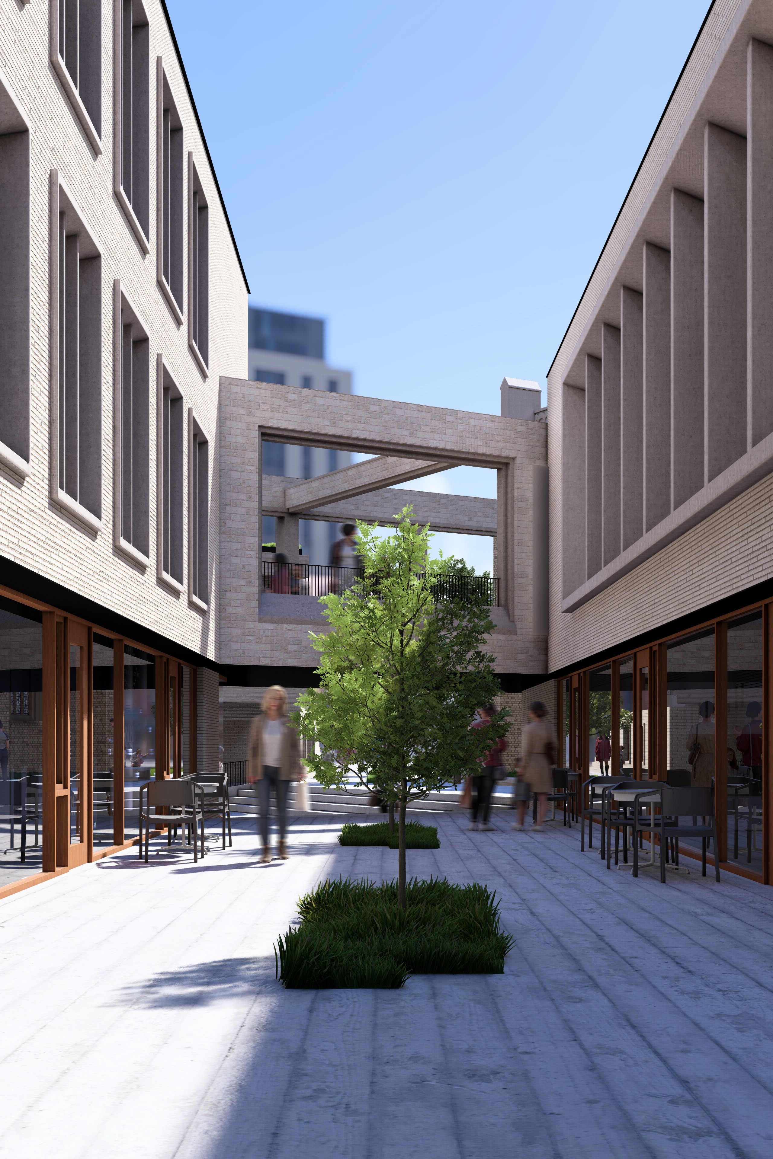 The central pedestrian space is lowered to assert the importance of the church, in a dynamic which mirrors the stairs of the altar which lies beyond the rear wall. A raised pedestrian space creates a unique perspective of the church, framing views of its rear facade and tower beyond.