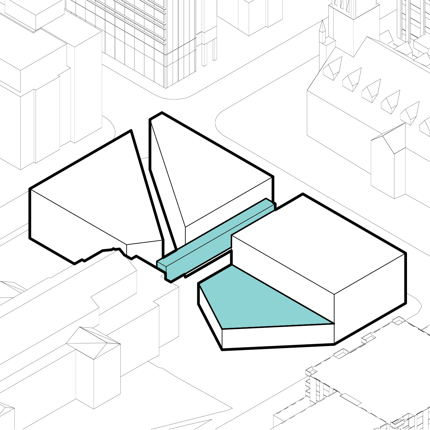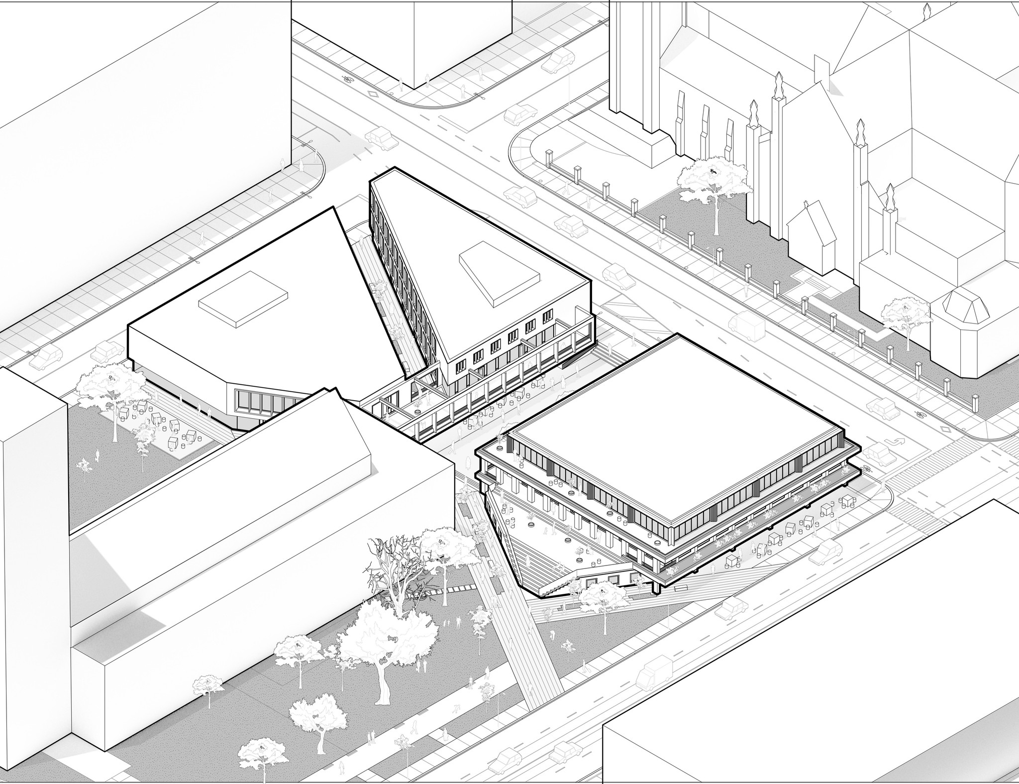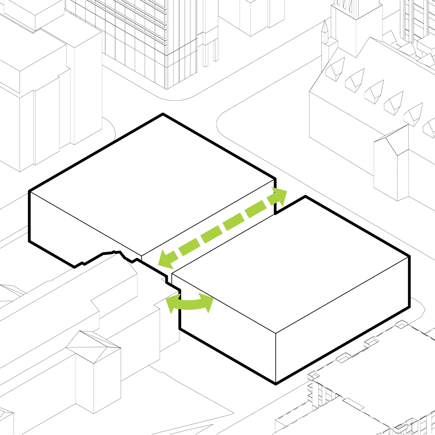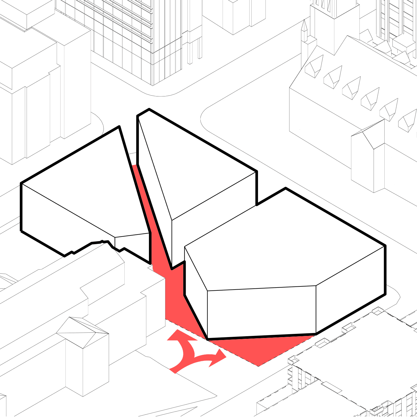 By ensuring that the two churches remain the central focus, the new buildings can honor the scale and materiality of the existing buildings, maintaining a prominent dialogue between St. Michael's Cathedral and the United Church. This interaction of spaces creates one of the most unique architectural atmospheres in Toronto where pedestrians can experience both of these impressive historical buildings in a space that compliments their rich qualities.