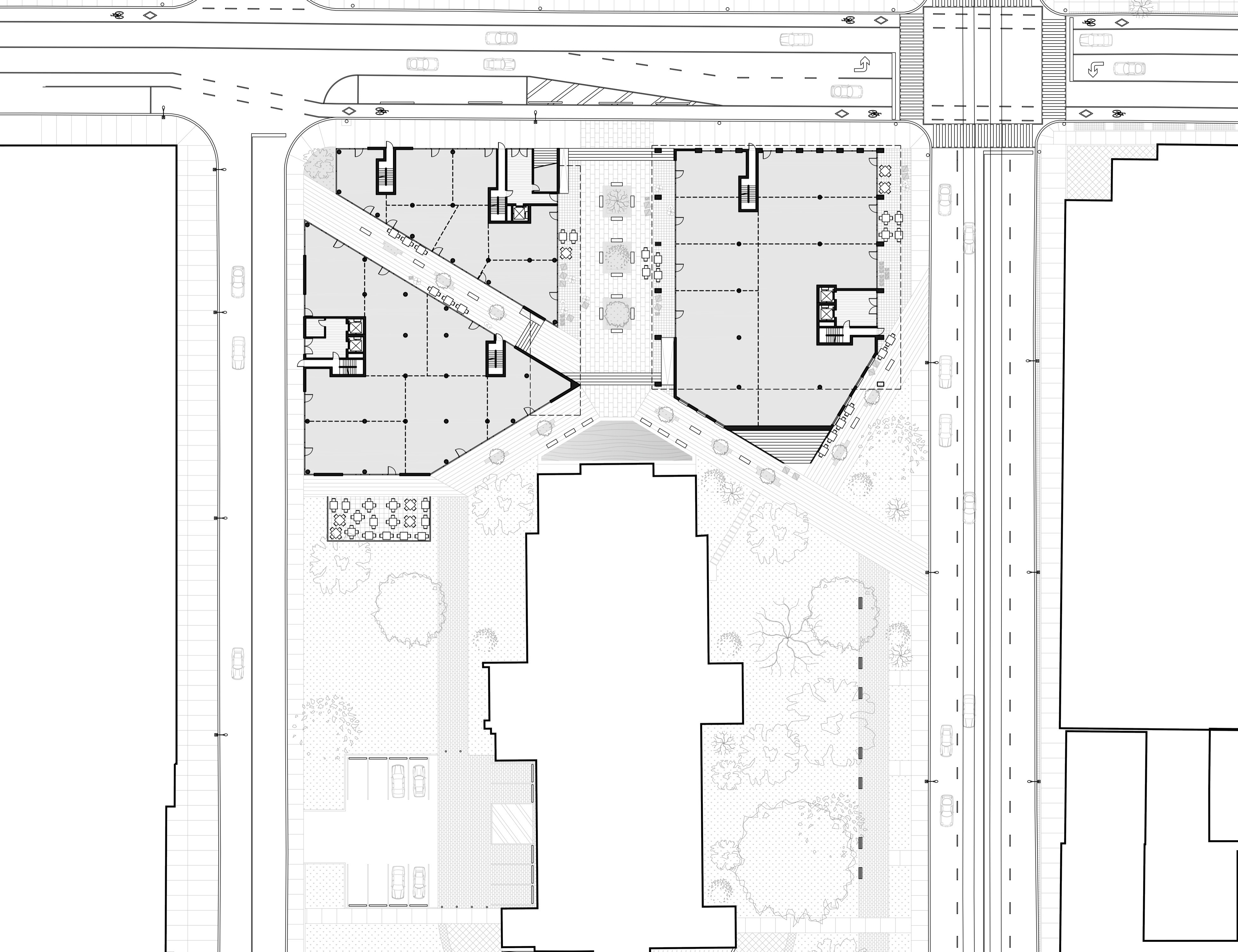 The parking lot at the south-west corner of Church and Shuter Streets in Toronto is owned by the United Metropolitan Church, which is also situated on the site. The lot was formerly home to the church's office and rectory space which was mostly demolished in 2008, with a small portion remaining standing but abandoned. The northern edge of the site neighbours St. Michaels Cathedral, another historically relevant building. The parking lot disrupts the pathways and landscaped space that exist on the southern portion of the site, but are forced to abruptly end to accommodate cars. The site poses a unique opportunity as it is part of an entire block of space under a single owner, allowing for a more large-scale, coordinated urban intervention.