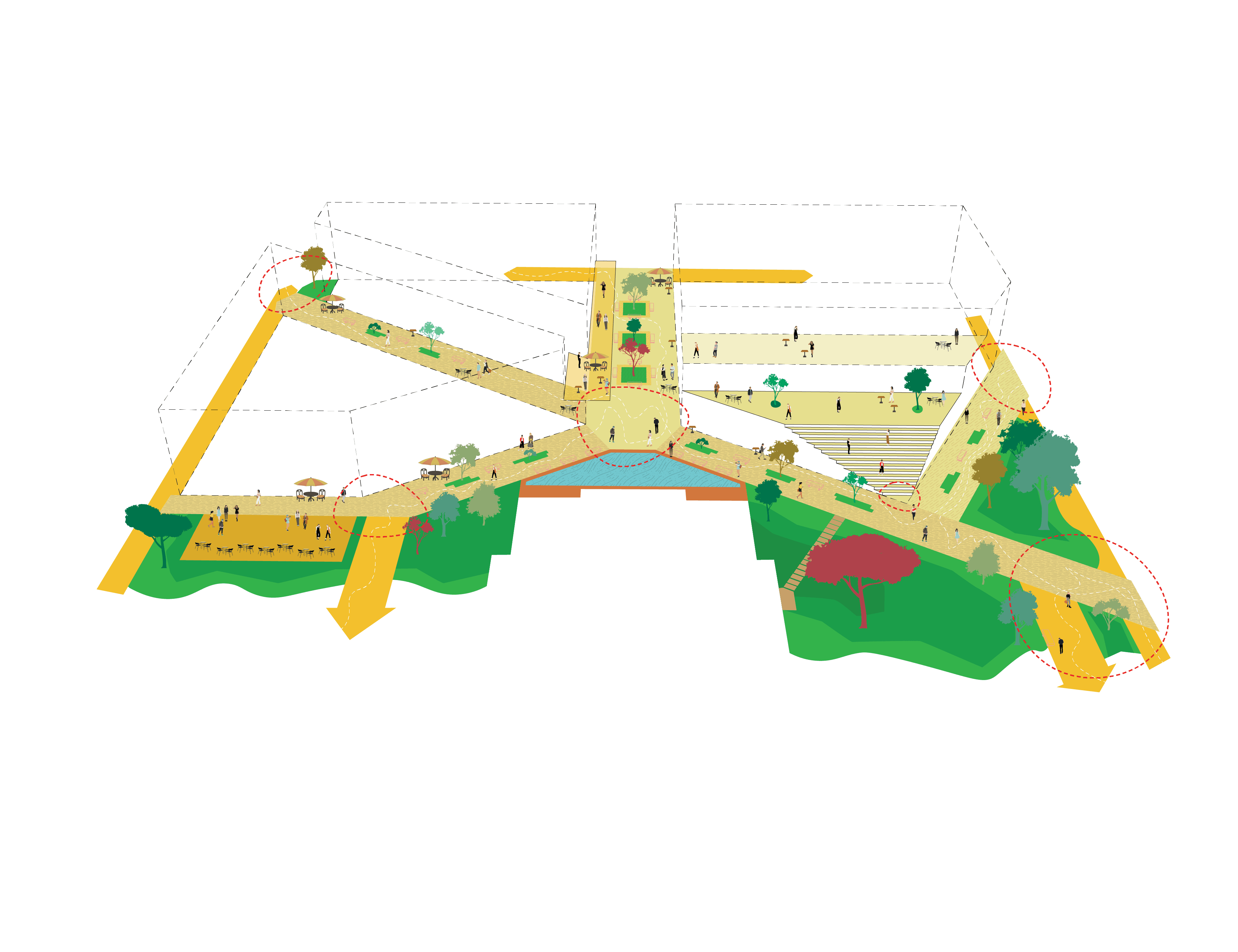 The site becomes a catalyst for serendipitous moments, drawing people into the site to explore the views, scale, and history of the site. Circulatory routes throughout the site encourage people to explore the site more freely, activating the space in ways that spark spontaneous interactions. This experience of discovery and hyper-accessibility transforms the site into a dynamic urban environment where serendipitous encounters and neighborhood engagement are naturally woven into everyday life.