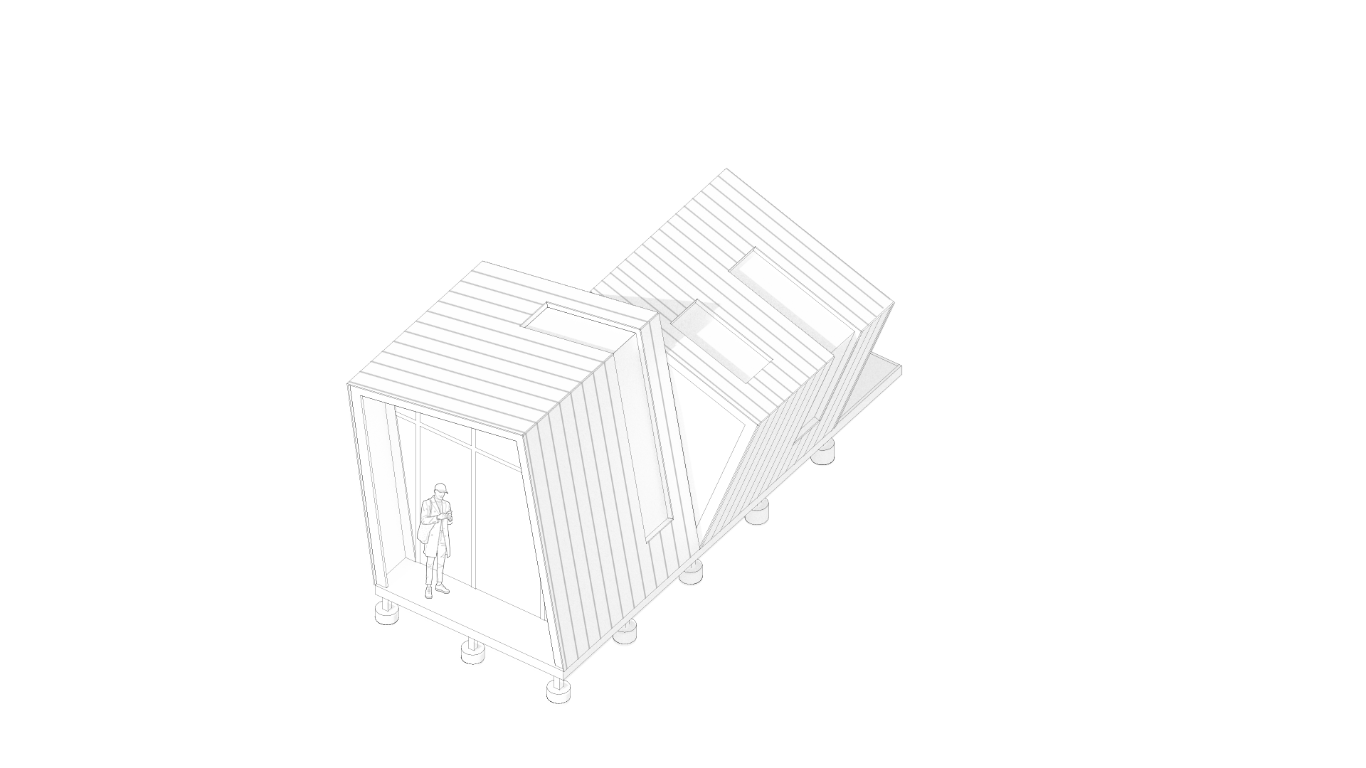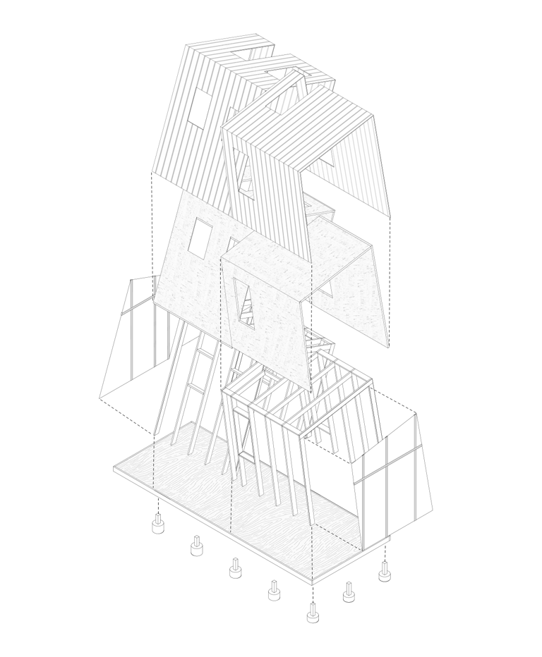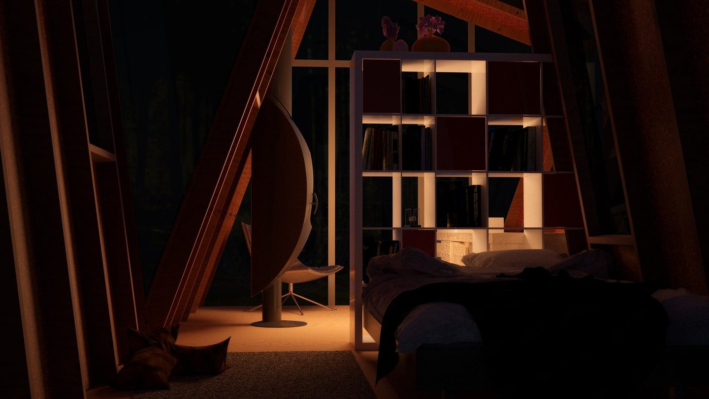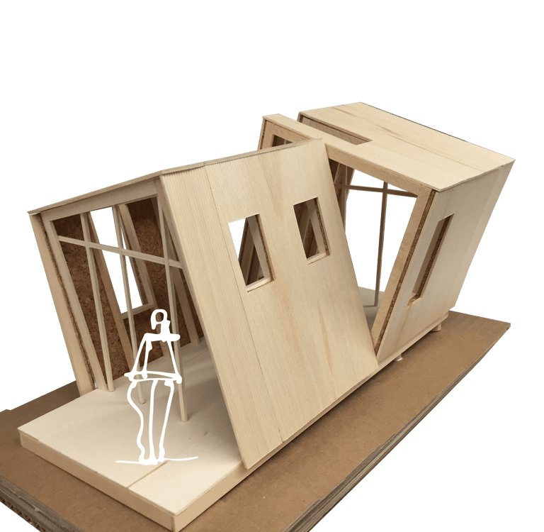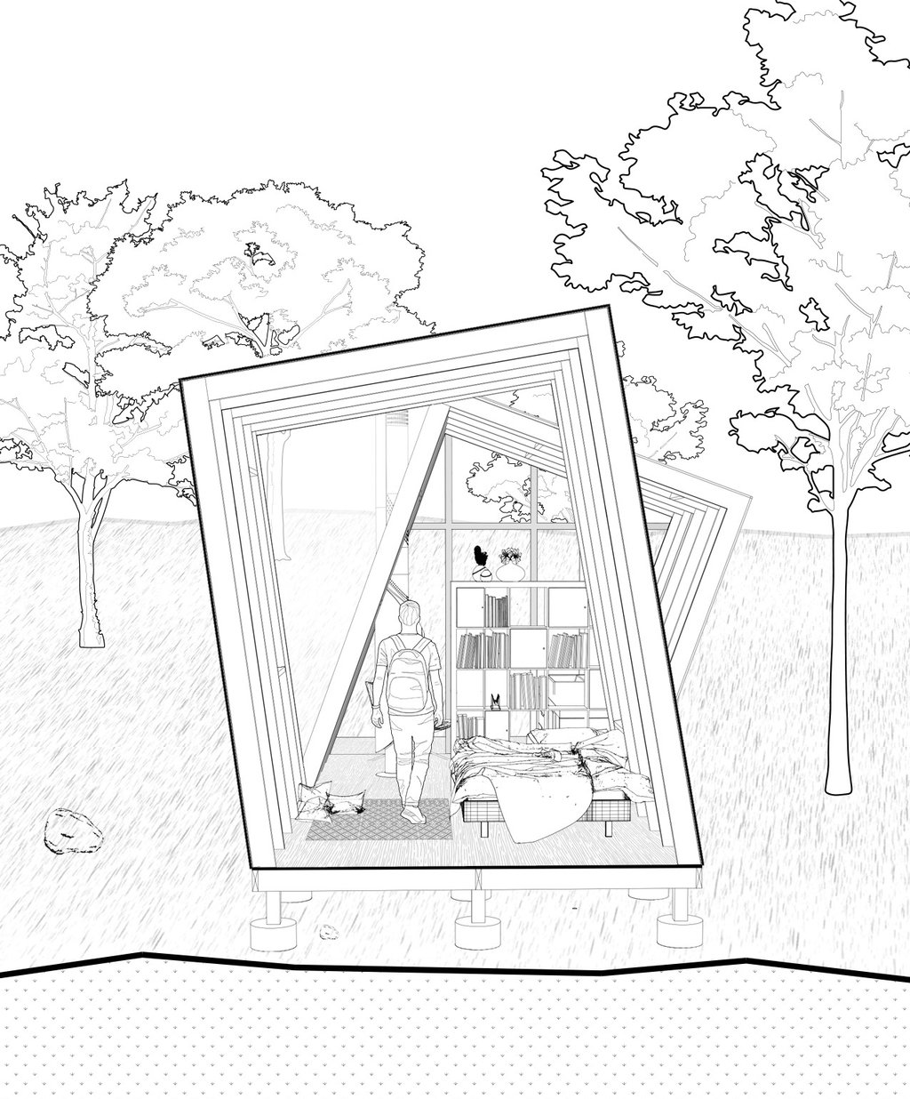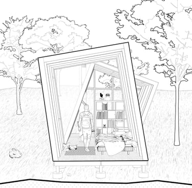 This meditation cabin's purpose is to create a tranquil space within the forest to support a single occupant for a short-term stay. The cabin is positioned on the site to take advantage of the view over a nearby pond, while also being directed towards the rising sun. The form consists of two main volumes which slant in opposite directions, creating a division of space while maintaining a rectangular floor plate. Half of the space is dedicated to utility needs, while the other half is catered towards creating a comfortable area for meditation and sleep. The windows which follow the slanted roof line are placed to create a sense of openness in the meditation space while becoming more closed towards the utility area. The offset volumes also create windows within the negative spaces, which allow for a more panoramic view of the landscape outside when seated in the meditation area.
