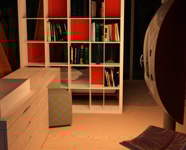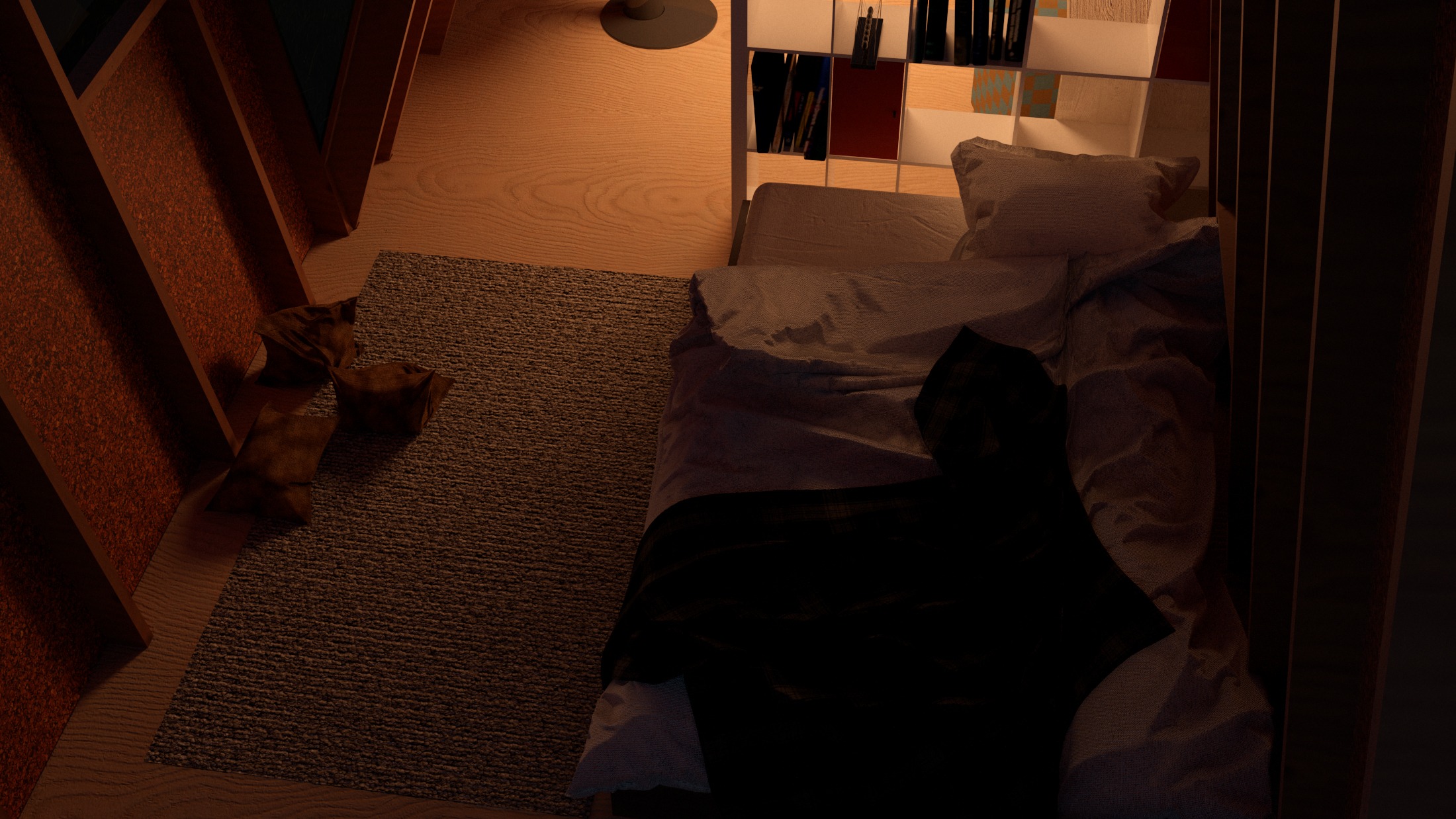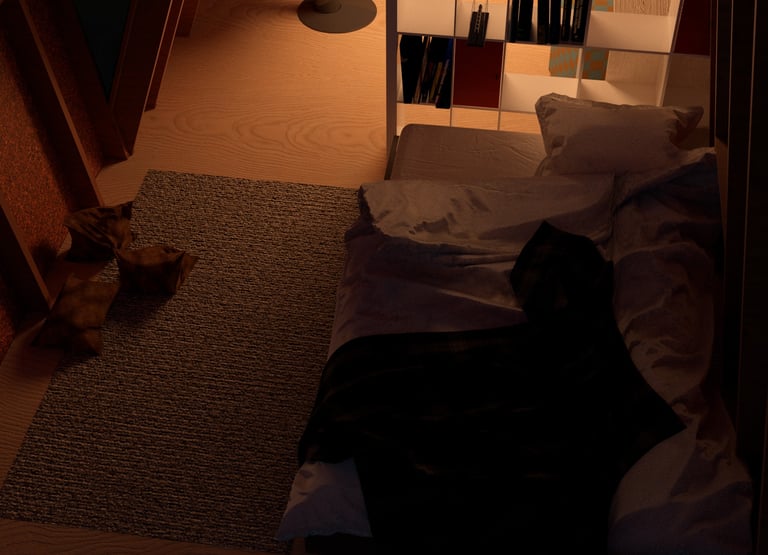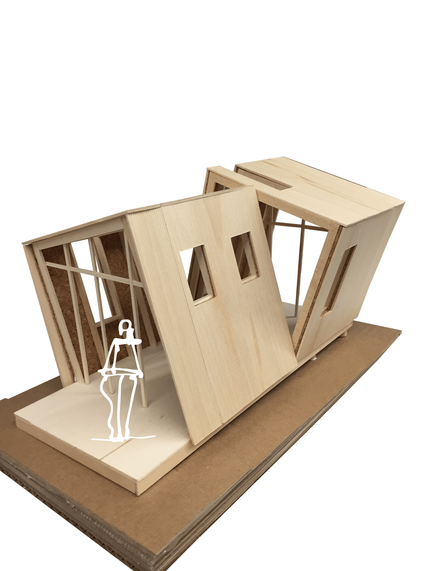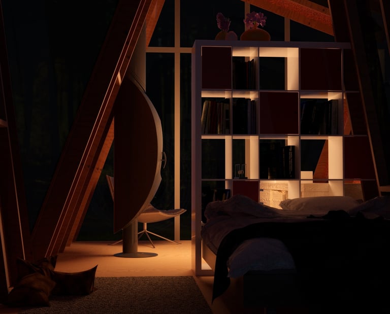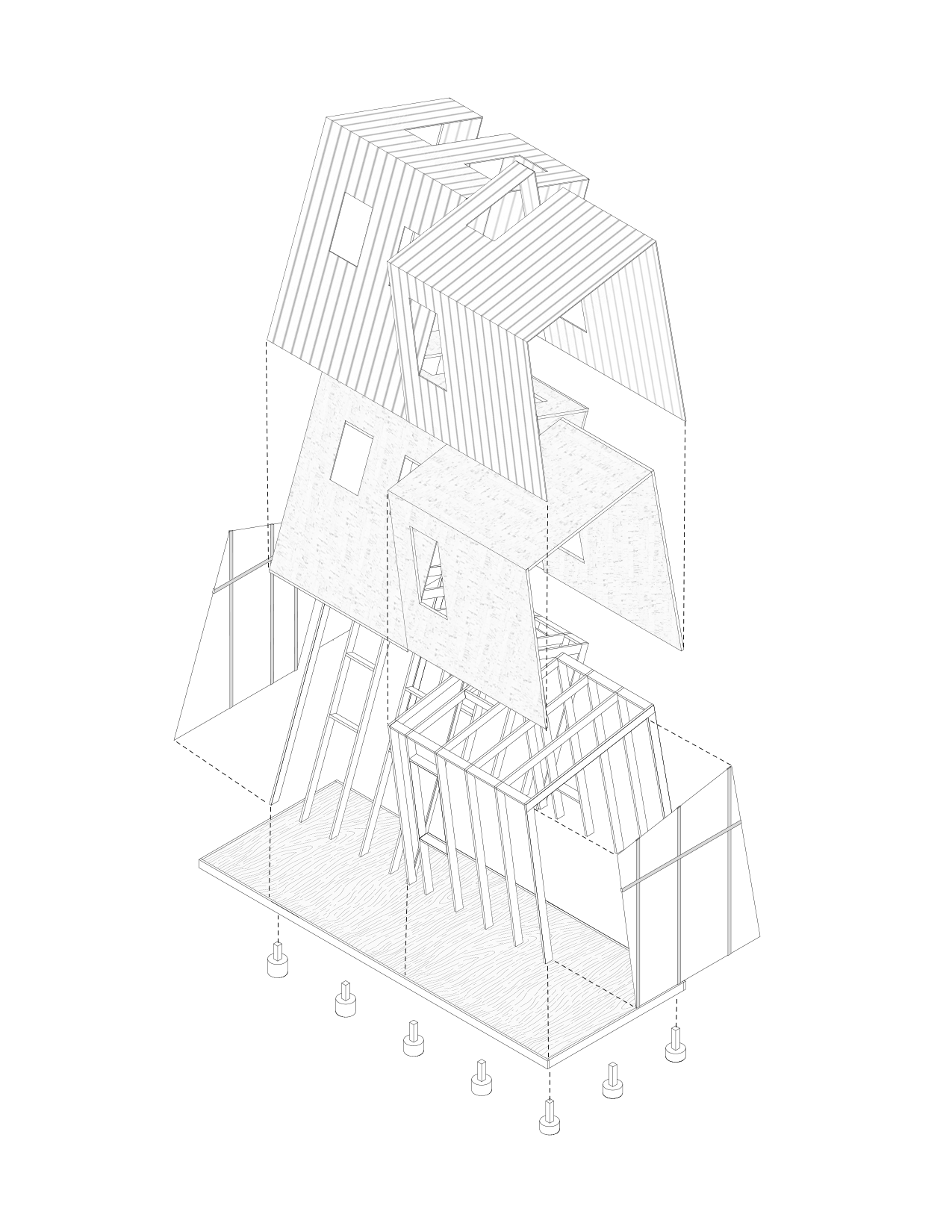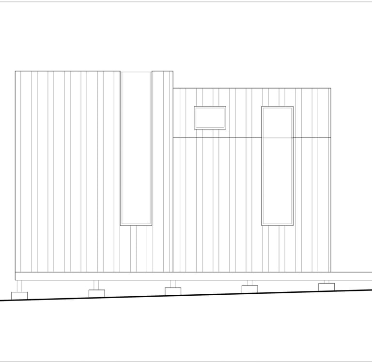 This meditation cabin's purpose is to create a tranquil space within the forest to support a single occupant for a short-term stay. The cabin is positioned on the site to take advantage of the view over a nearby pond, while also being directed towards the rising sun. The form consists of two main volumes which slant in opposite directions, creating a division of space while maintaining a rectangular floor plate. Half of the space is dedicated to utility needs, while the other half is catered towards creating a comfortable area for meditation and sleep. The windows which follow the slanted roof line are placed to create a sense of openness in the meditation space while becoming more closed towards the utility area. The offset volumes also create windows within the negative spaces, which allow for a more panoramic view of the landscape outside when seated in the meditation area.